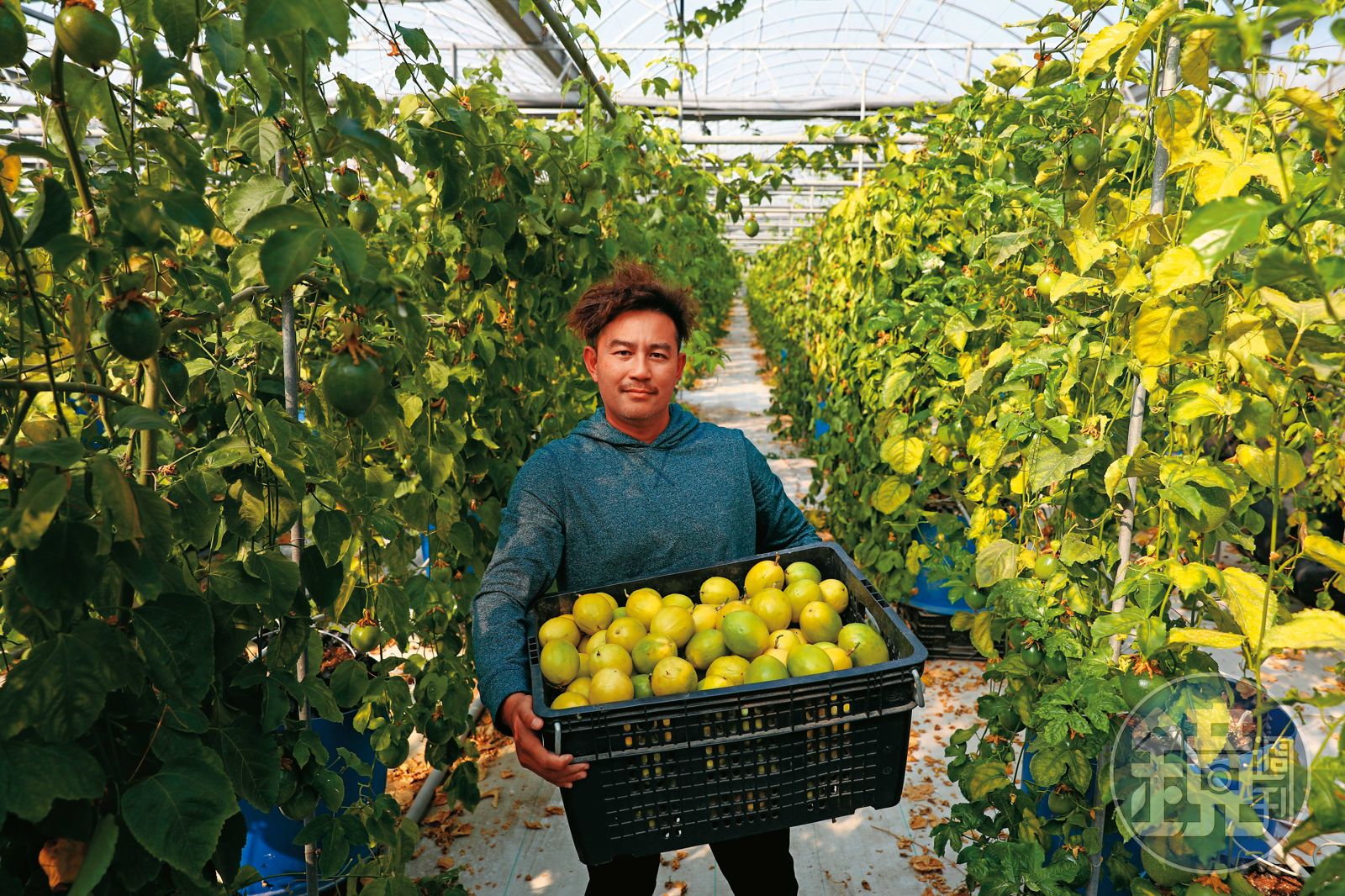 「我就是不想再被現在的環境卡著,我本來種溫室水果,最近貸款8千萬元,跟朋友一起投資蓋蛋雞場,屋頂要自己鋪太陽能板。」一位皮膚黝黑,燙著玉米鬚頭的青農陳育旗豪氣地說。幾日後,我們到陳育旗的溫室。他今年40歲,是嘉義人,有6分地的溫室種植百香果與小番茄。與話少不善表達的農民印象不同,陳育旗講起話來非常快,條理清晰,打開話匣子就停不太下來,「其實我無時無刻想要結合農作跟光電,因為有被動收入,眼睛睜開就有錢。但為什麼我們不喜歡太陽能業者?因為他們只是來掠地、租地。」