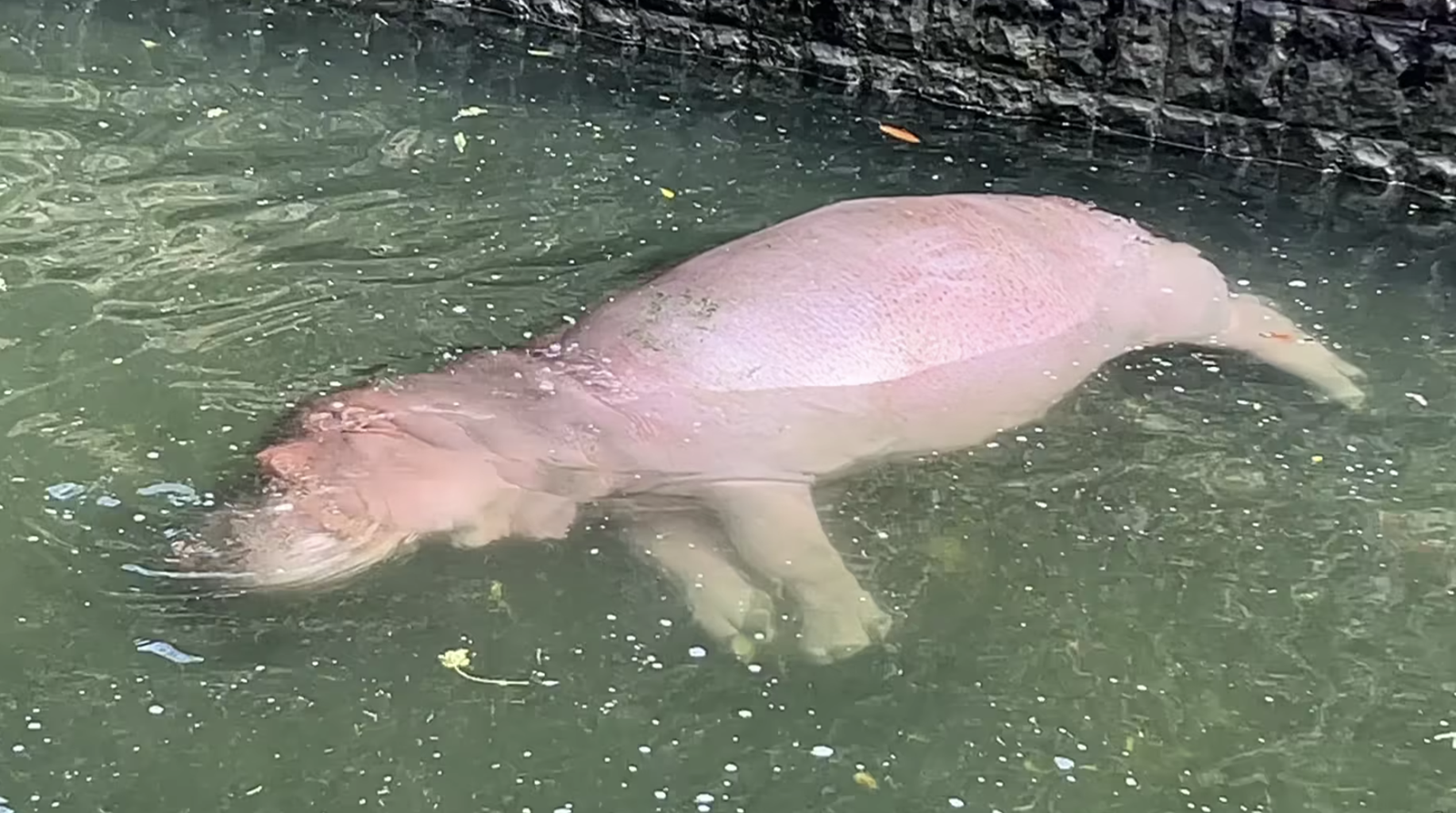 畫面中,香香側躺浮在水面,只露出一點點側面肚皮,不仔細看會誤以為香香「出事了。」小編說明,其實這是每週四河馬池大清洗換水後,常見的畫面,通常上午清洗完二邊水池的河馬便便後,會開始注水,等到下午3點水池有一定的深度後,才會放迫不及待的「河馬三朵花」和隔壁的孔孔下水。