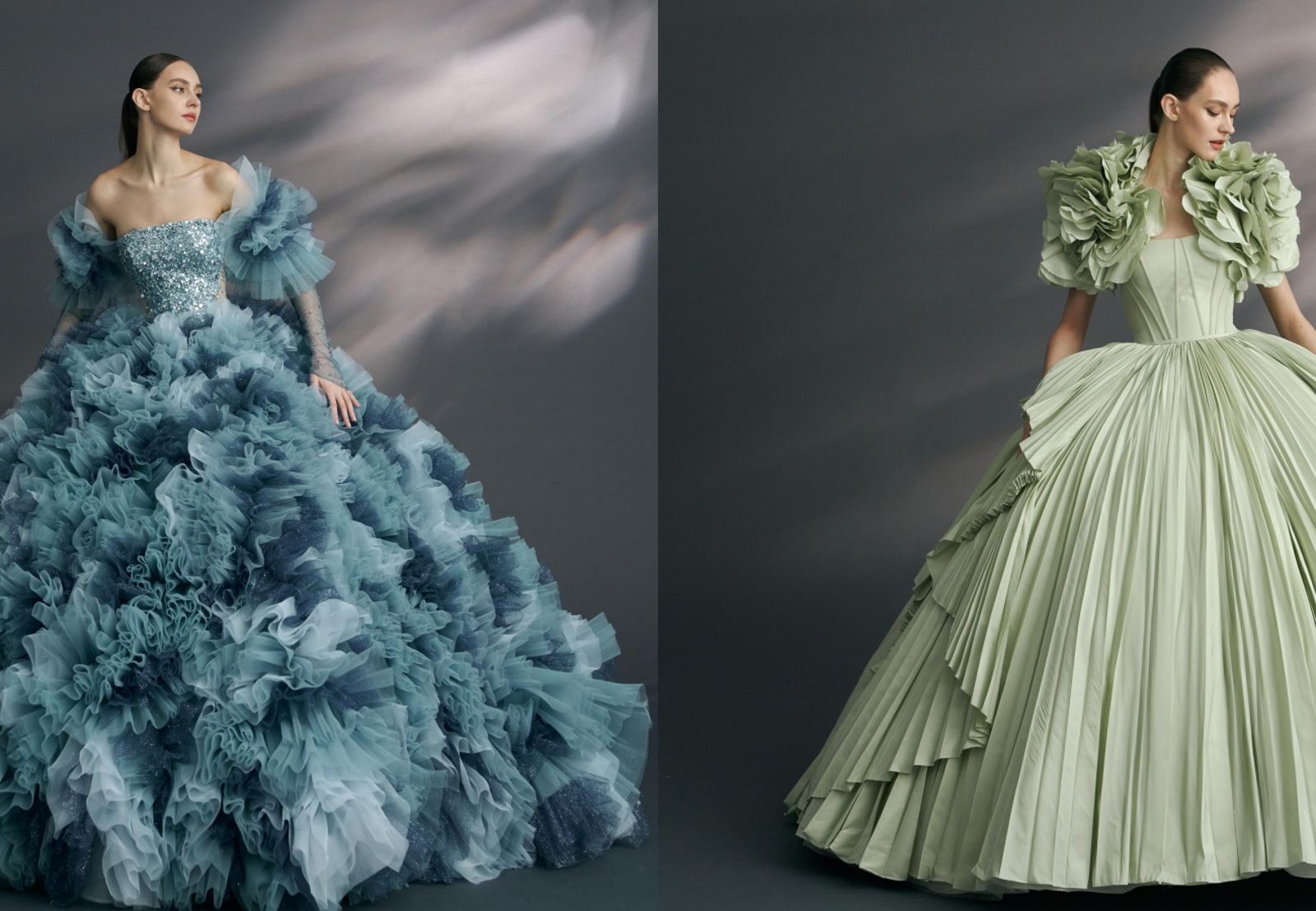 (左起)使用3種顏色網紗做層次堆疊的蔚藍色層次晚禮服《Hydrangeas 繡球花》、青蘋綠壓褶晚禮服《Peony 牡丹》。(LinLi Boutique 提供)發布時間:2024.04.02 14:03 臺北時間