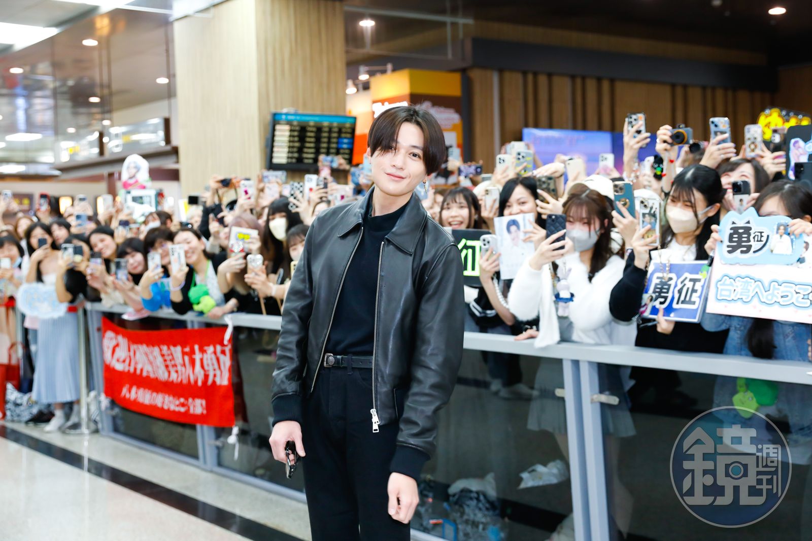 日本男團FANTASTICS from EXILE TRIBE成員八木勇征,今(6日)上午抵達台北松山機場,機場一早就湧入來自台灣、日本、香港與韓國等近600名粉絲死守接機大廳。八木勇征於11點04分帥氣現身,現場立刻響起尖叫聲;聽到粉絲大喊:「Welcome to Taiwan!」八木勇征也回了:「謝謝。」盡顯來台的好心情。