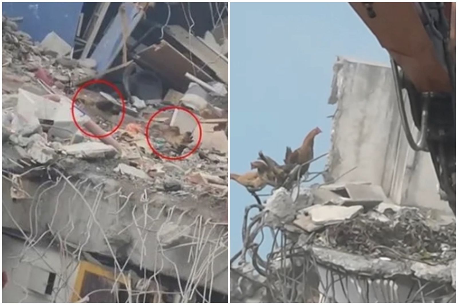 王星大樓住戶因突如其來的地震,逃難時來不及戴上寵物逃難,大樓內目前仍有5隻雞、3隻貓受困,據了解,稍早怪手挖到頂樓時,頂樓有4隻雞緊張亂竄,有的飛到低層樓,暫時離開危險地方,不過也有一隻雞展翅高飛時,疑似被線勾到腳,整隻被拉住,吊掛在廢墟中,畫面險象環生。