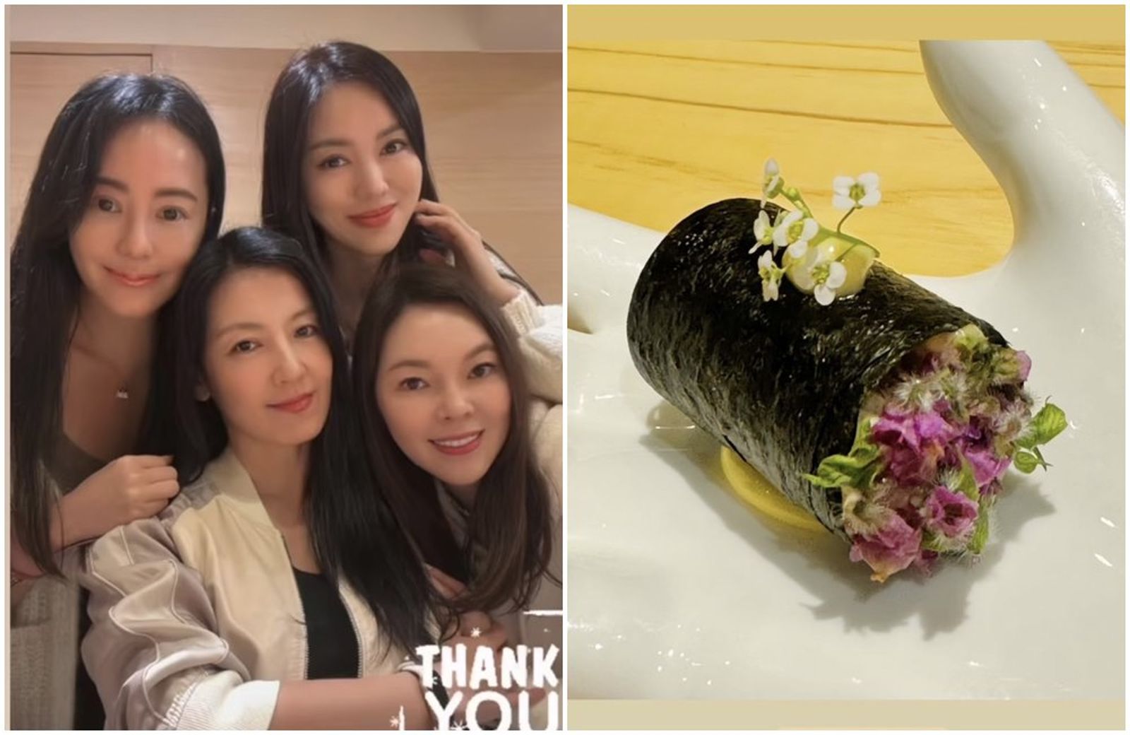 曾馨瑩(左圖前排右起)、林熙蕾、林牧潔(左圖後排右起)、關穎一起到米其林一星「壽司芳」(右圖)用餐。(翻攝曾馨瑩、關穎IG)發布時間:2024.04.18 12:59 臺北時間