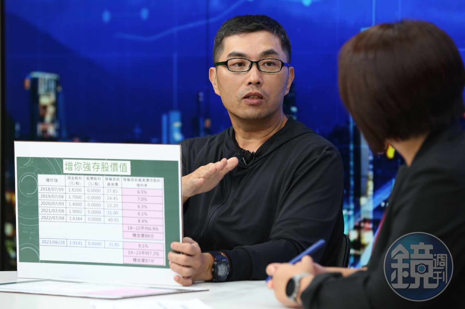 他分享,值得長期存的個股,必須具備3條件:1.歷經市場波動,長期配息穩定;2.至少5年以上配發不錯的股息;3.就算買在高點,殖利率仍可維持超過4%。「例如,增你強知名度雖不是太高,但長期配息穩定,過去6年就算買在股價相對高檔位置,殖利率都還有7%以上,若投資人買得更便宜,殖利率表現就更好了。」