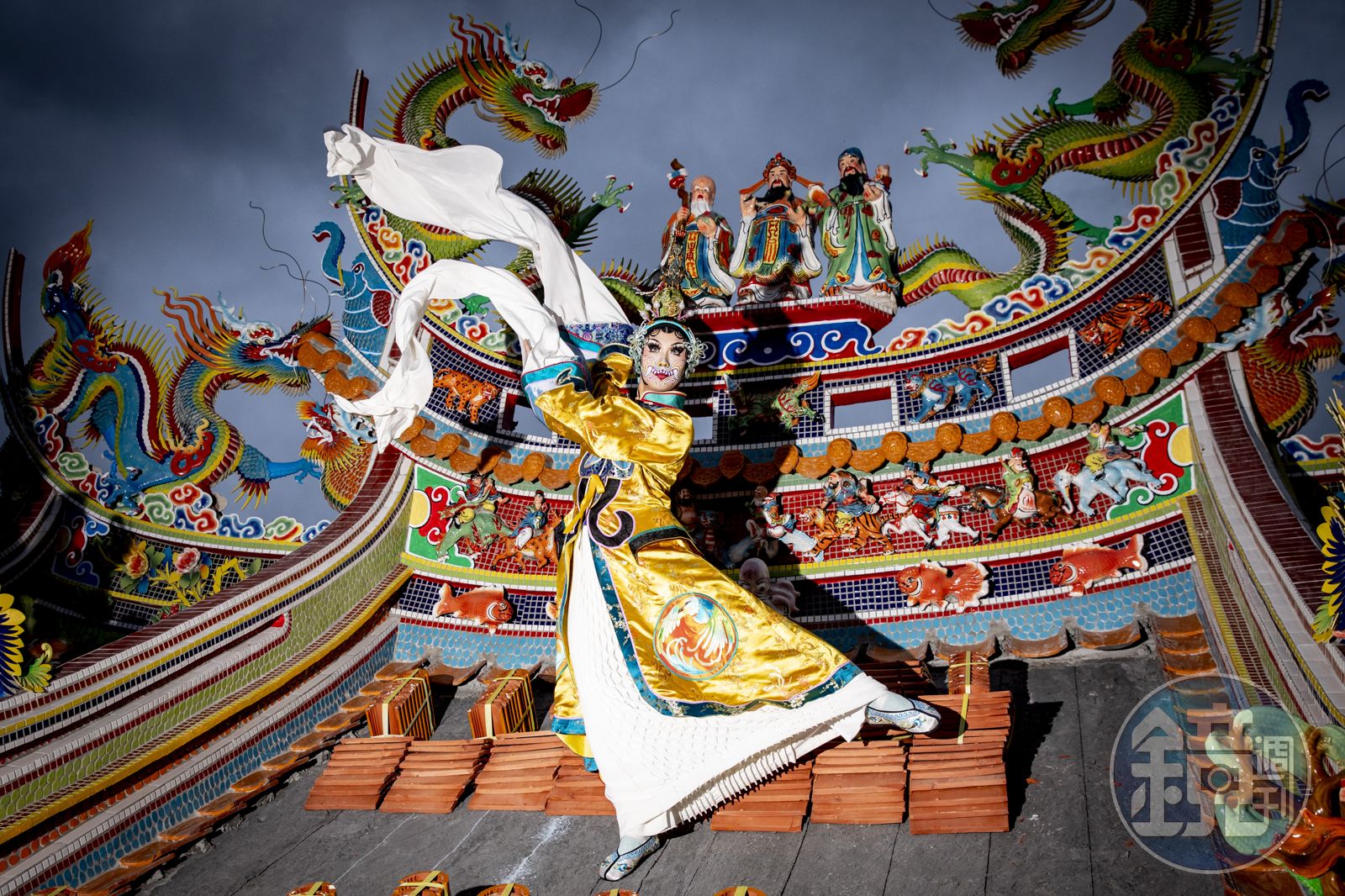 時間逐漸緊迫,他厲聲發作:「不要跟我講話!」把我們趕到另一個房間去。8個小時過後,我們終於出門。此時我和攝影已臨近虛脫邊緣,反倒是妮妃雅愈見亢奮,備上古典水袖裝,準備從邋遢荷葉邊T恤脫身,頂著傳統戲劇花臉,粉墨登場、招搖過市。