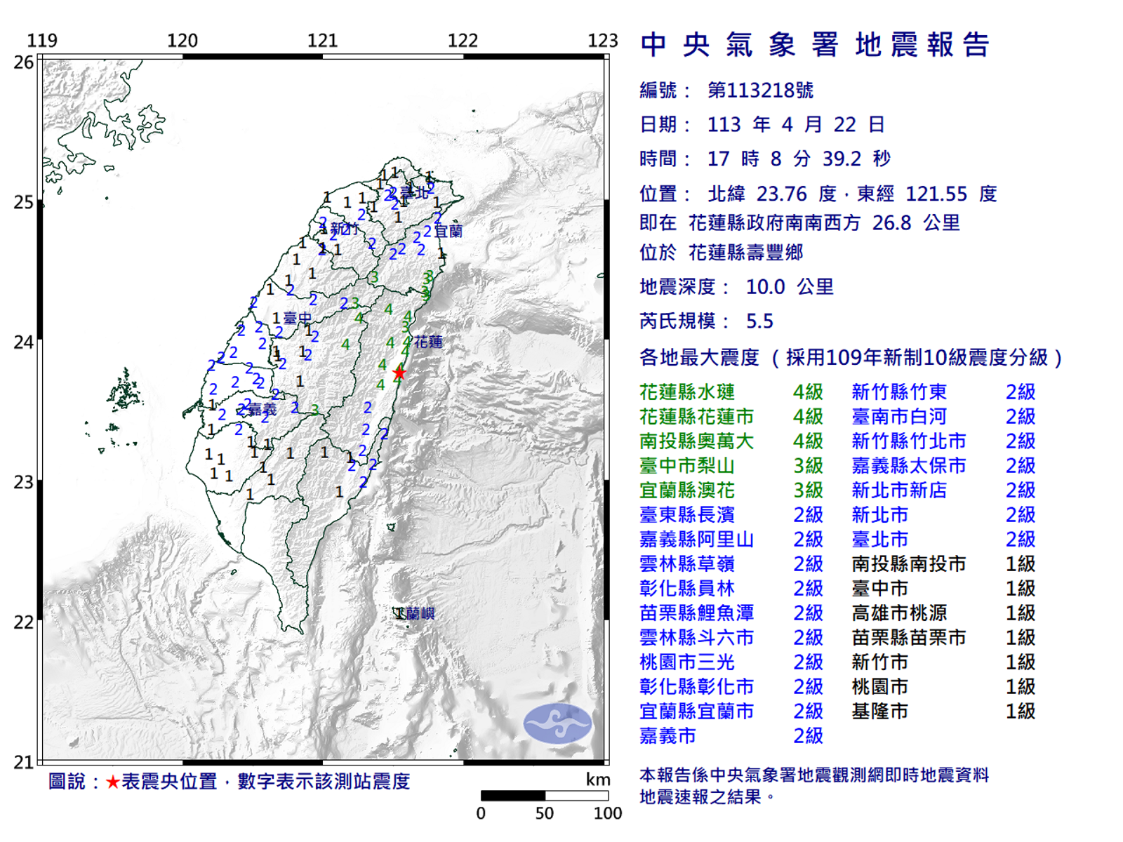 中央氣象署表示,22日晚間5時8分花蓮地區附近發生芮氏規模5.5地震,震央位於花蓮縣壽豐鄉,地震深度10公里,震度4級以上地區為花蓮,3級以上為台中、宜蘭。 後續17:09再度地震,震央同樣位於花蓮縣壽豐鄉,芮氏規模4.4,地震深度9.5公里;17:12、17:15、17:17發生芮氏規模5.3、4.9、4.9,深度分別為10公、5.4公里、2.8公里,均為淺層地震。