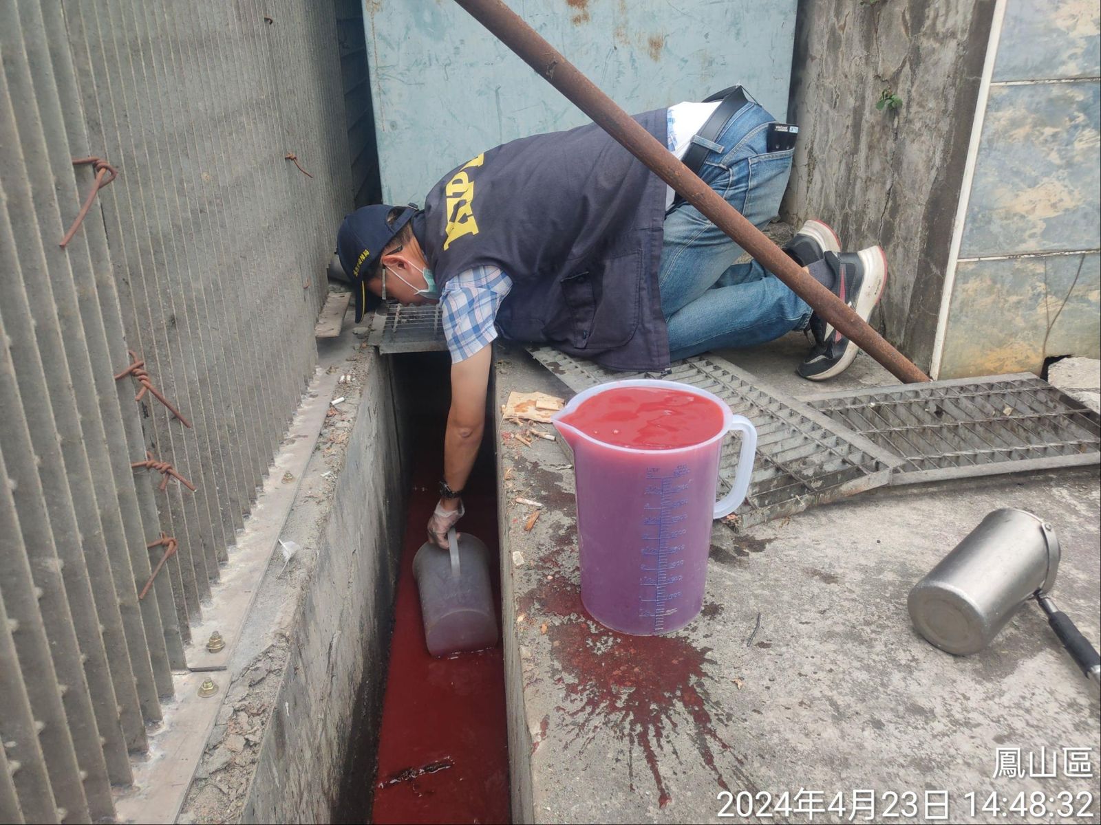 高雄市環保局持續針對「鳳山溪水汙染管制區」加強稽巡查,今日在鳳山鳳仁路巷弄內發現有血紅色廢水排出,循線往上稽查至該工廠,是從事葉黃素、魚油、B群等膠囊保健食品製造,廠內僅設置1座截油槽,且設備處理效能不佳,致產生血紅色廢水,逕自排放至廠外水溝,循水路汙染鳳山溪支流坔埔排水,依違反《水污法》第30條規定,裁處3萬至300萬元罰鍰。