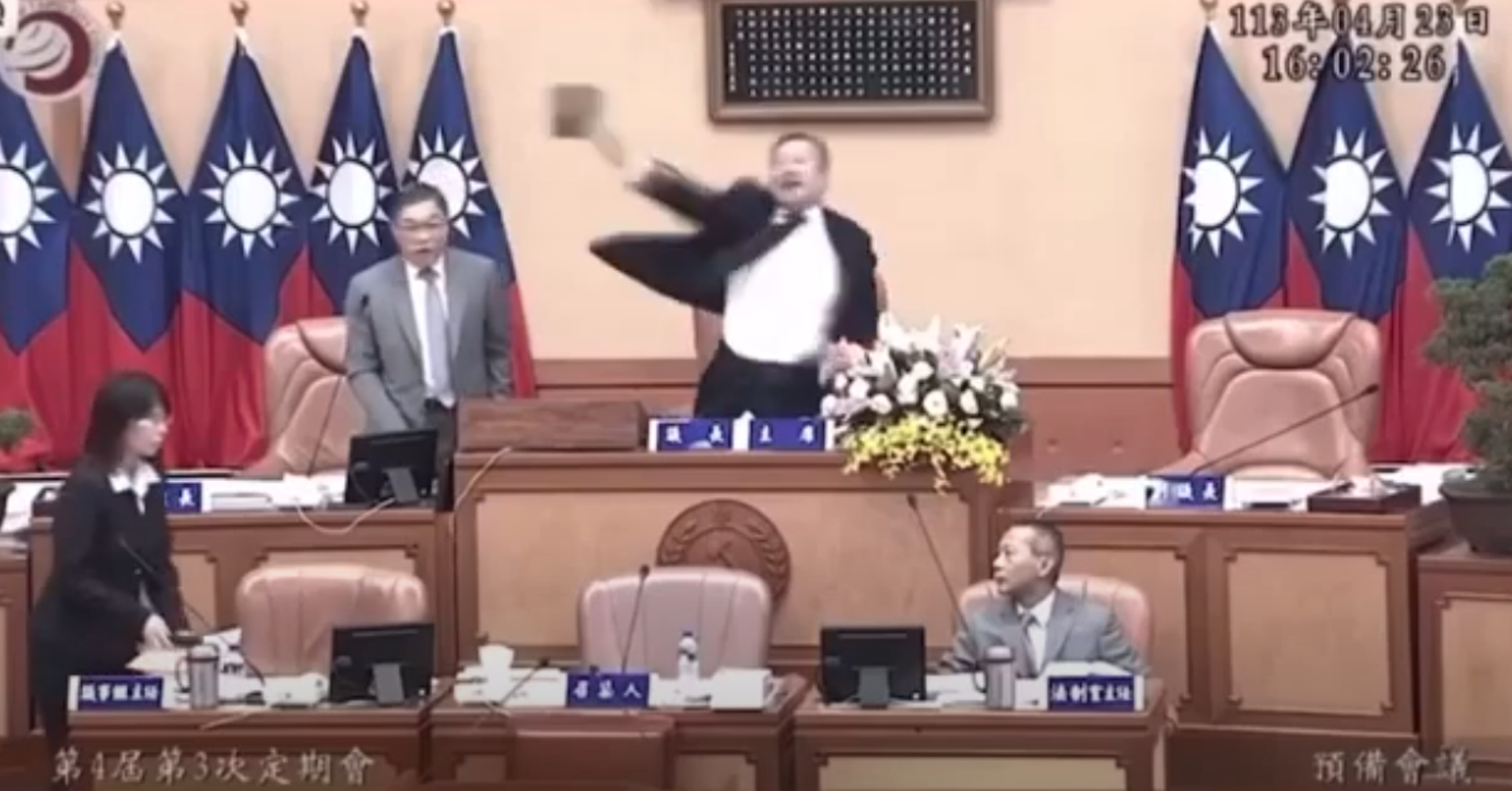 隨後,蔣根煌重返主席台,但依然怒氣未消,直接再朝台下開噴:「X,什麼X,是在糟蹋什麼。」因台上麥克風未關,蔣粗口連發直接被轉播系統放送,議會秘書長陳王正源連忙趨前關掉麥克風。