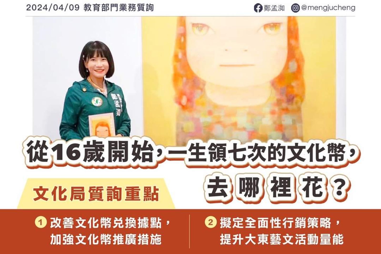 鄭孟洳認為,文化局角色過於消極,應更加積極推廣配套活動,刺激青年來高雄使用文化幣消費。文化局王文翠局長也當場允諾,檢討文化幣兌換據點,落實文化平權,並透過配套活動加強青年朋友對文化幣的使用。