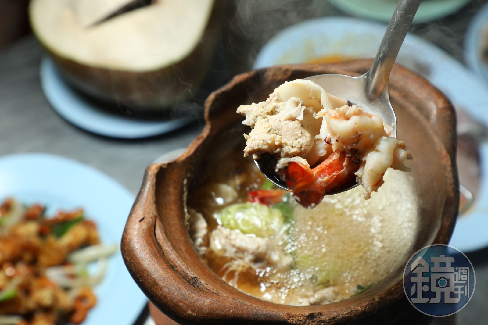 最強招牌菜當然是用小陶鍋炭火燒煮的「綜合鍋」,其實就是一個小火鍋,湯頭不是想像中的酸辣,而是頗富特色的清甜湯頭;綜合鍋配上一個海鮮豬肉盤和一個綜合菜盤,豬肉上還會放一顆生蛋,當炭火升起來,陶鍋裡的高湯咕嚕咕嚕冒泡,肉片裹著蛋液一起下鍋,吃起來更滑嫩。