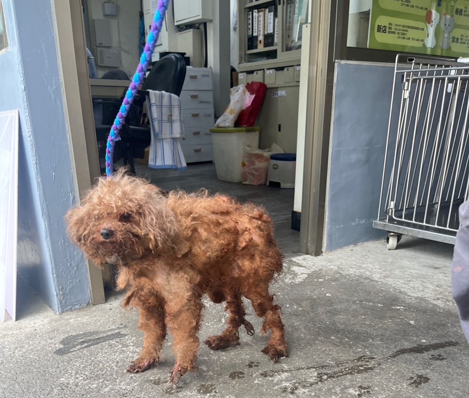 新北動保處指出,民眾吳小姐表示,三峽民生街附近有許多商家,她常常在附近採購生活所需物品,當日她如常上街採買,突眼角餘光瞄到街角有隻小型犬倒在地上,近看發現是毛髮沾黏成硬塊、看不到臉眼的紅貴賓,下腹部破裂受傷正在滲血。由於紅貴賓全身顫抖氣息微弱,便趕緊撥打1999緊急救援通報動保處救援。