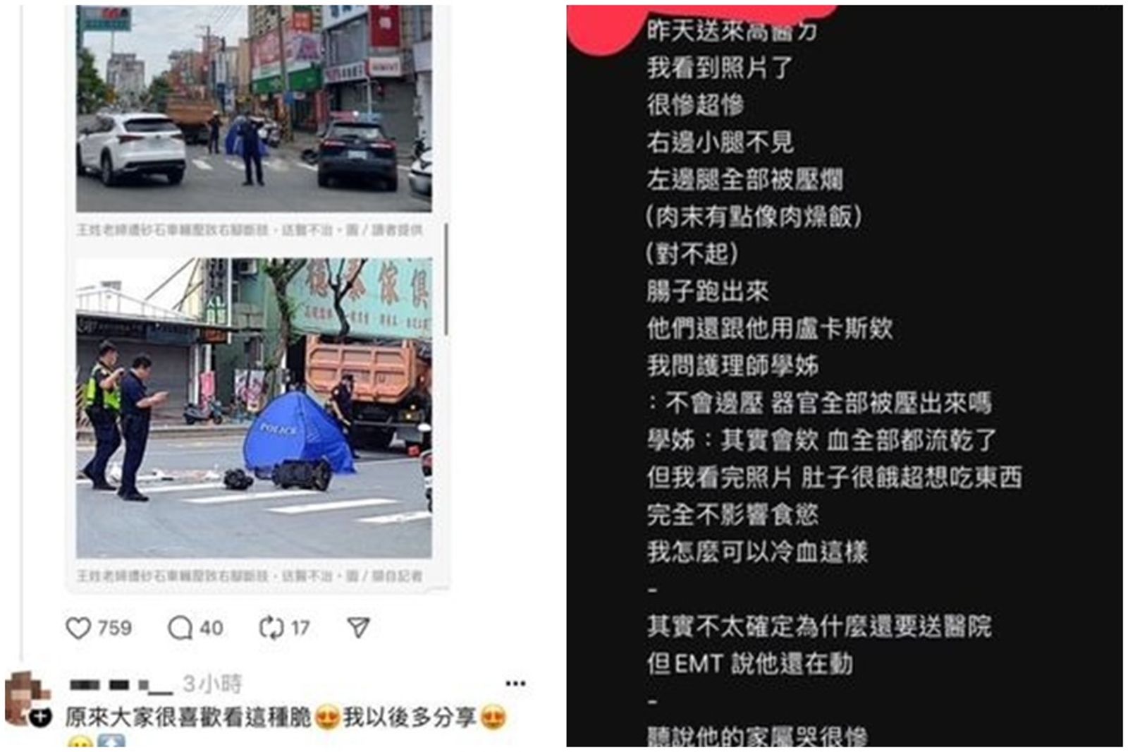 據了解,高醫工讀生在社群平台Threads上PO文評論死者「左邊腿全部被壓爛,肉末有點像肉燥飯」,文章一曝光引發軒然大波。對此,高醫今發聲明稿針對急診部工讀生發文一事,向死者家屬及社會大眾致上誠摯的歉意,並表示他們已對該名工讀生暫時停職並進行輔導關懷,同時配合衛生局調查後,後續也將依規定妥適處置。