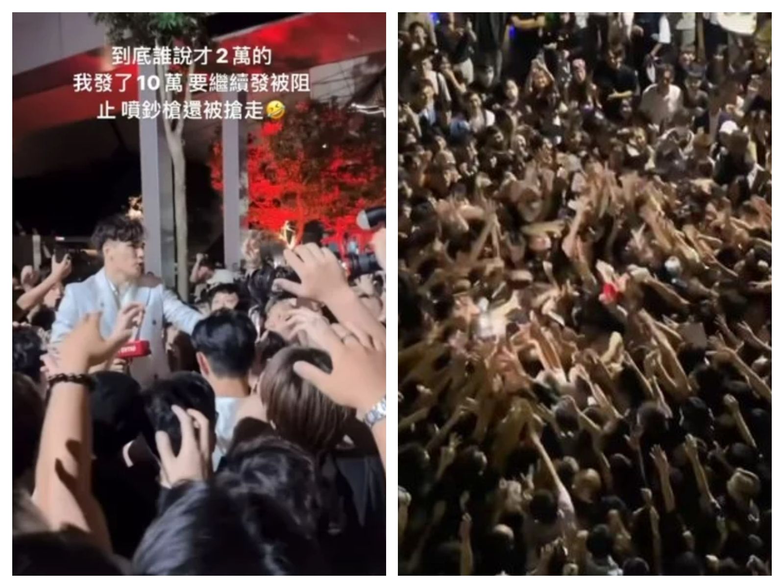 網紅Mr.R深夜在信義區使用噴鈔槍撒錢,現場湧入3,000人,讓外界憂心恐出現類似南韓梨泰院的踩踏事件。(翻攝自Instagram@mr.r.bro、社會新聞影音)