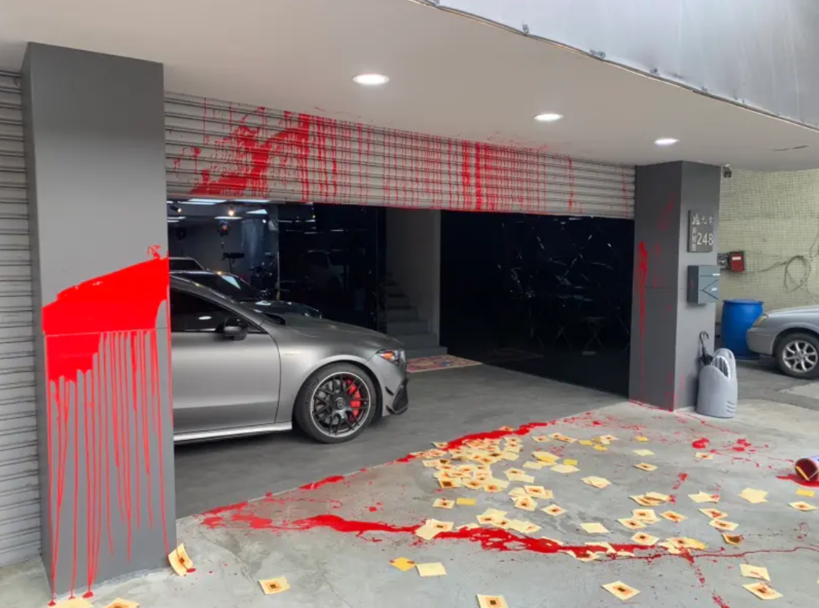 不料今日清晨九葉車行又遭人惡意潑紅漆,撒了冥紙,周圍牆面也被貼上黑白的傳單,傳單上印著Joeman多年前的舊照片,寫著「我Joeman翁雋明,跟前女友在一起期間家暴,給封口費遮掩事實,還吸食大麻,身為公眾人物我罪該萬死」等。
