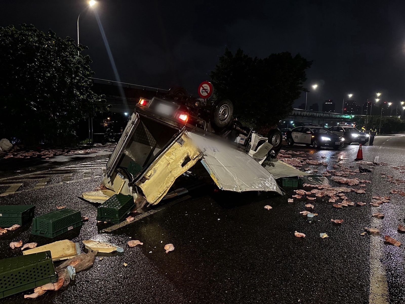 警方表示,今天凌晨3時45分,該輛由翁姓男子(39歲)駕駛的貨車,沿水源快速道路往東方向直行第3車道,翁男疑似因天雨路滑,未注意車前狀況,前車頭不慎撞擊外側護欄,導致整輛車失控翻覆,四輪朝天,車身破損嚴重,車上載運的生鮮雞腿也布滿在車道上,幸好沒有波及其他車輛。