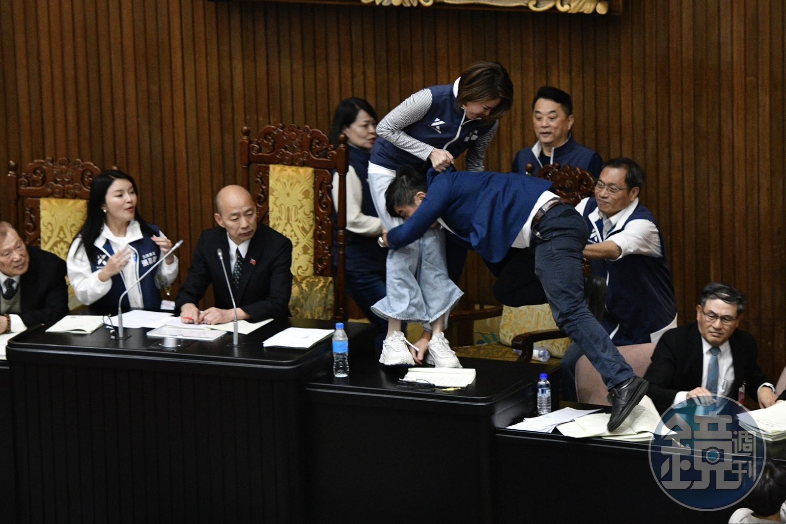 議事進行到第48案、國民黨團提議逕付二讀,民進黨團反對,韓國瑜宣布按鈴7分鐘進行表決,綠委趁藍委離開主席台、回到座位領取表決卡進行表決的空檔,再度衝上主席台。當鍾佳濱跳上主席台時,韓國瑜身旁的陳菁徽立刻也跳上桌反制,試圖反推鍾佳濱,而鍾佳濱則向前一滑,抱住陳菁徽的腿將她撲倒,2人扭打至主席台下,其他藍委見狀上前將2人拉開。