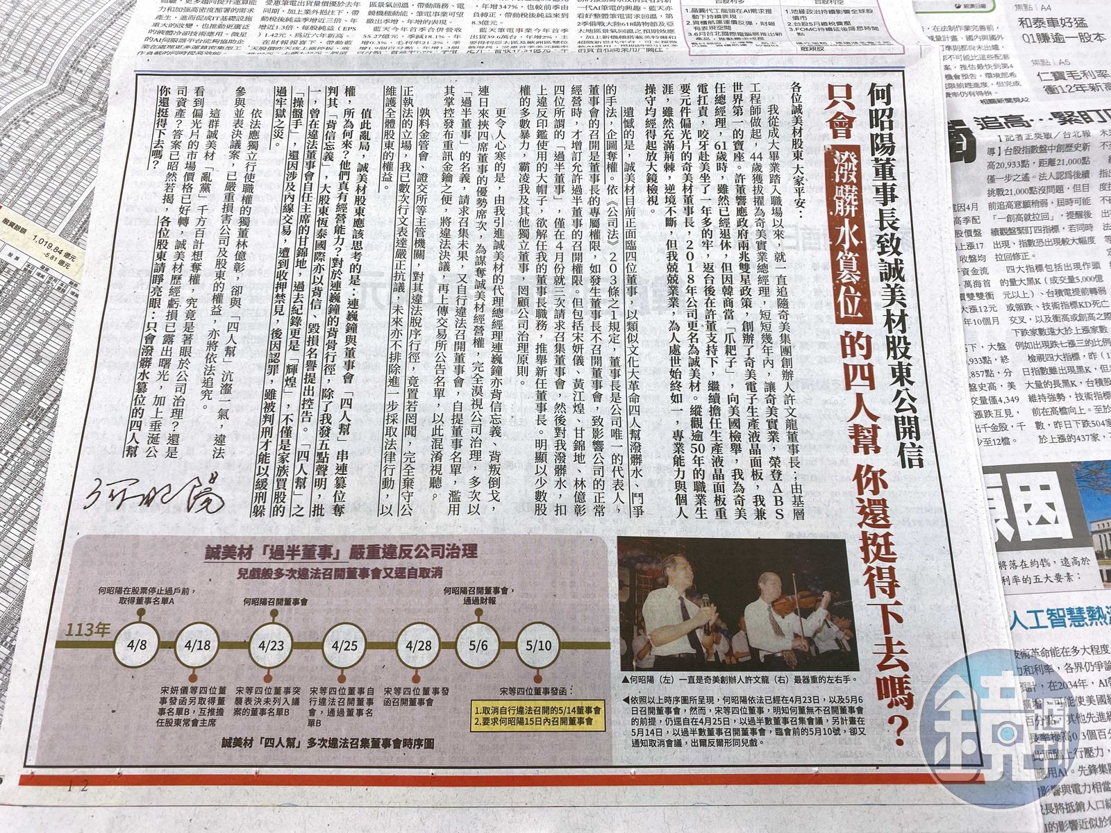 本刊調查,誠美材這次會爆發經營權之爭,主要是董事長何昭陽與總經理連巍鐘二派陣營意見不合,雙方不僅鬧上法院,還登報紙廣告大打媒體戰。