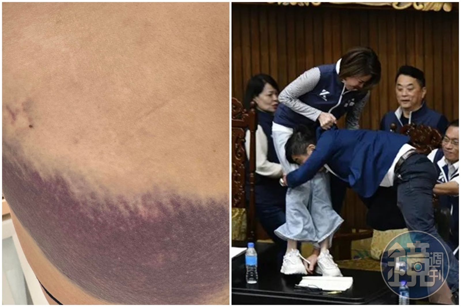 陳菁徽表示,凌晨回家時才發現,臀部有大面積黑紫色腫塊,且手機不斷跳出網路側翼蓄意剪輯的圖文攻擊,網路上還有不少民進黨人士,紛紛轉發黑底白字的「我藐視把人摔地上的國會」的圖卡。