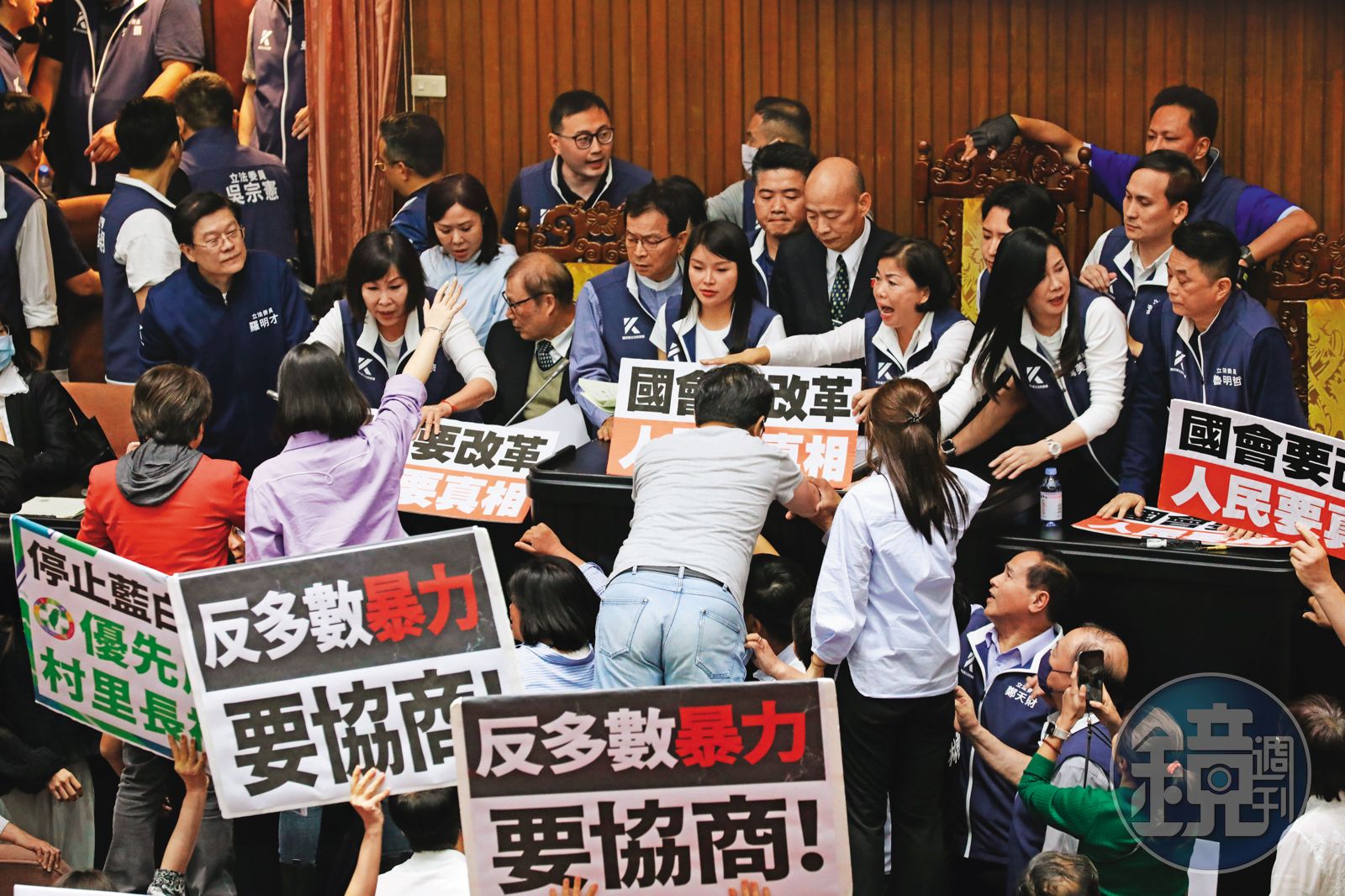 總統賴清德520宣誓就職,隔天立院朝野攻防戰火持續延燒!藍白黨團力拚總統國情報告等條文三讀通過,民團也在網路社群號召民眾立院集結。本刊掌握,綠營尋求結合理念相同的民團,擴大論述,爭取民意,力壓藍白陣營聯手提出的立委職權修法闖關成新國會惡例,確保未來4年議案能有折衝空間,並緊抱《憲法》,同時為捍衛朝野協商機制,綠營大小黨鞭近日放軟態度,向手握關鍵決定權的立法院長韓國瑜喊話,希望他能調和鼎鼐,化干戈為玉帛。