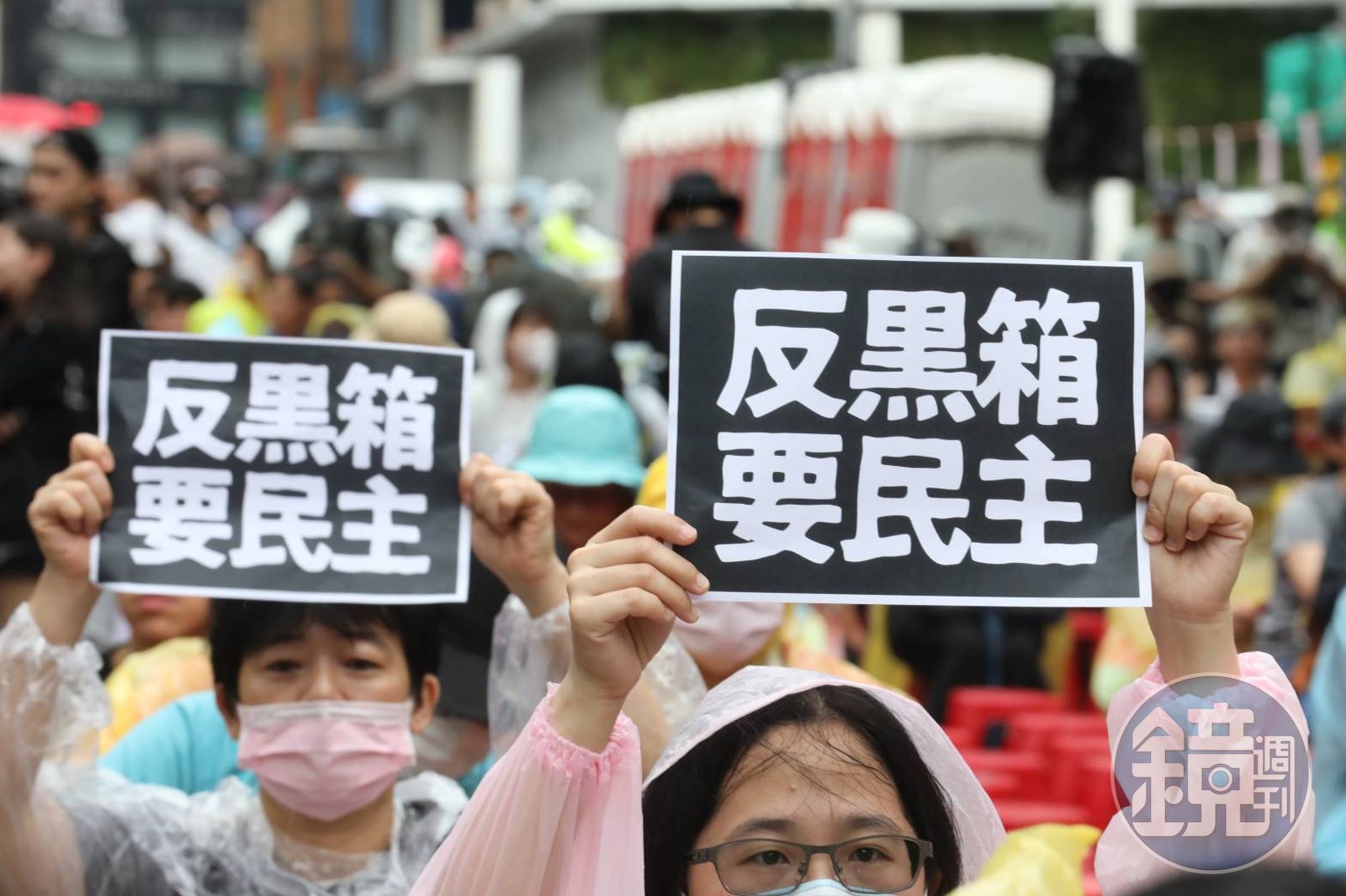 今日天候不佳,陰雨綿綿,議場外仍有大批民眾身穿雨衣、熱血抗議,高舉「反黑箱、要民主」牌子。發布時間:2024.05.24 12:07 臺北時間