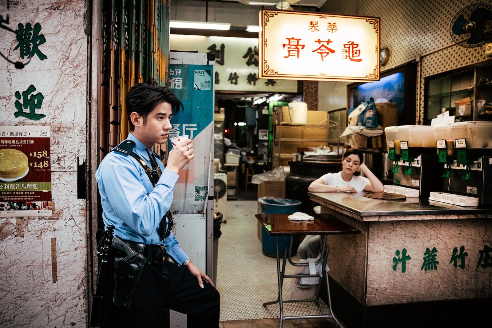 馬力歐換上茶餐廳夥計的襯衫,不忘叼著牙籤。(翻攝自Mario Maurer臉書粉絲頁)馬力歐另換上茶餐廳夥計的襯衫,叼著牙籤,變身《行運一條龍》中周星馳飾演的何金水,他說:「看香港電影,我同時可以用眼睛品嚐香港傳統美食!點心、叉燒,當然還有茶餐廳美食。」馬力歐也造訪紅磡一間戲院,這是香港仍採用人手劃位方式售票的戲院。戲院大廳牆上掛著一幅幅傳統電影海報,復古味十足。