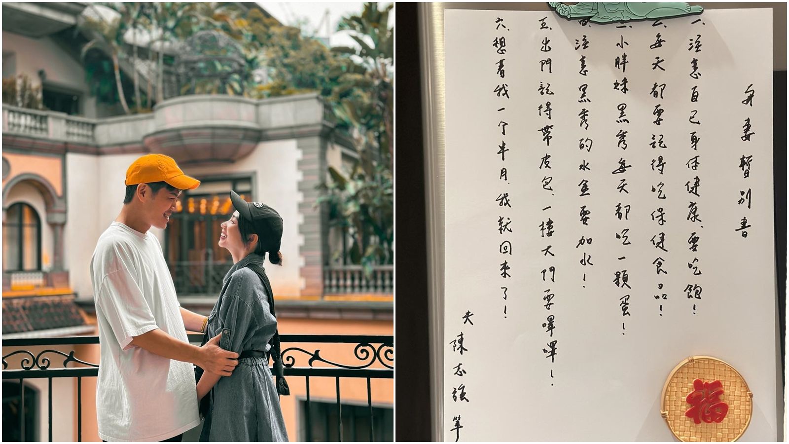陳志強手寫六點「與妻暫別書」,字裡行間都是提醒曾智希要注意身體、出入注意安全,甚至不忘提點老婆要照顧愛犬黑秀,「一、注意自己身體健康要吃飽!二、每天都要記得吃保健食品!三、小胖妹黑秀每天都吃一顆蛋!四、注意黑秀的水壺要加水!五、出門記得帶皮包,一樓大門要嗶嗶!六、想著我一個半月,我就回來了!」發文一出讓不少網友大誇小倆口的互動很有趣,甚至有不少網友大誇陳志強相當幽默。