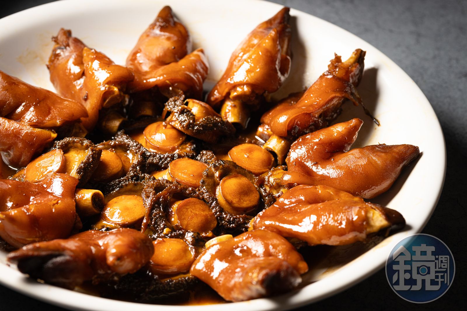 臨上桌前,依請客人數,取適當的鮮鮑豬手數量,連同原本各自的醬汁共燴一爐。猛火收汁後,鮑魚的鮮甜與豬手的鹹香完美結合,擺盤上桌,絕對是搶盡風頭,吮指回味的主菜。