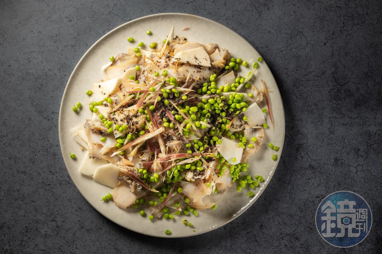 第三樣東西是小豌豆。小豌豆也是季節限定,冬春最好,現在已經是尾巴,我加這個主要是貪其清甜口感和鮮綠顏色。因為松露醬汁有黑色,只是鮑魚竹筍,顏色不跳,暗下去了,一定要鮮綠增明亮度,這樣菜看起來才好吃。而涼拌菜一定是隨季節變化,小豌豆過季可以改成水蓮菜或鴨兒芹,青綠爽口就好。