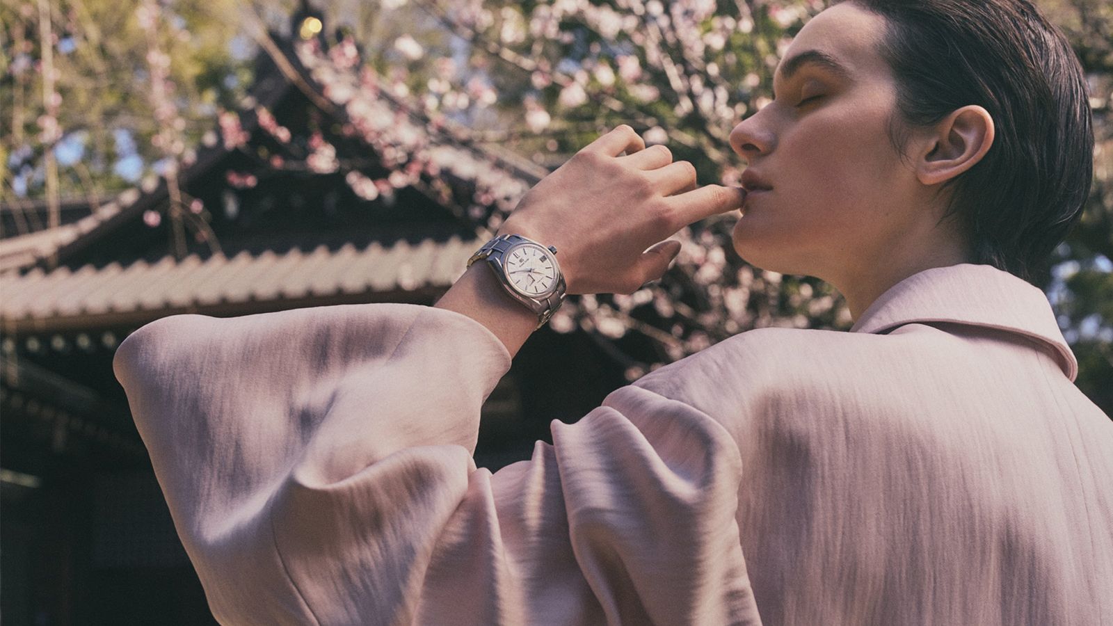 這次的Tokyo Time主題GS選了三款手錶當主角,分別是白樺樹面盤的SLGH005、首款機械計時Tentagraph SLGC001、以及粉色面盤代表作春分款SBGA413,每只錶款都選了一個不同的建築和景點來演對手戲。其中SBGA413和建築的連結最為強烈,照片裡的景色從原宿、表參道等街區,到日本建築大師丹下健三(Tange Kenzo)設計的國立代代木競技場都是路過的風景。對於處於戰後重建時期的日本來說,1964年的東京奧運是很重要的成果展演,於是在東京展開了大規模的建設,其中國立代代木競技場就是極為重要的代表作,而那個年代也恰巧是GS剛開始起步的時間點。在Josh Olins的鏡頭下,Model戴著SBGA413每一幀照片過場的方式,像極了春分款面盤詮釋的櫻花隨風旋轉般,緩緩飄落在水面上的景色,每個分解動作都很輕柔,但整體呈現卻很有力道。