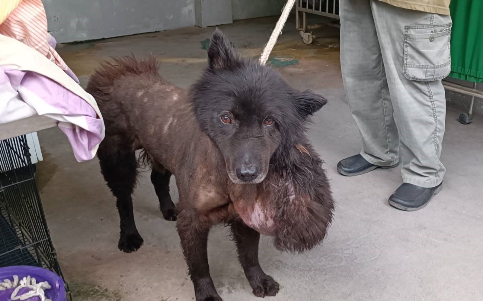 新北動保處表示,這間宮廟位於林口忠福路山區,早年收留了幾隻流浪狗,其中一隻小黑狗個性相當活潑,喜歡陪著來上香的遊客散步,也常有遊客餵牠寵物罐頭,很受來往遊客喜愛,廟方也對牠十分疼惜,多年來建立了深厚的情誼。近年來廟方發現小黑脖子上長了顆跟臉差不多大的瘤,隨著時間過去越長越大,甚至壓迫身體影響走路,腫瘤破裂滲血,於是求助五股動物之家。