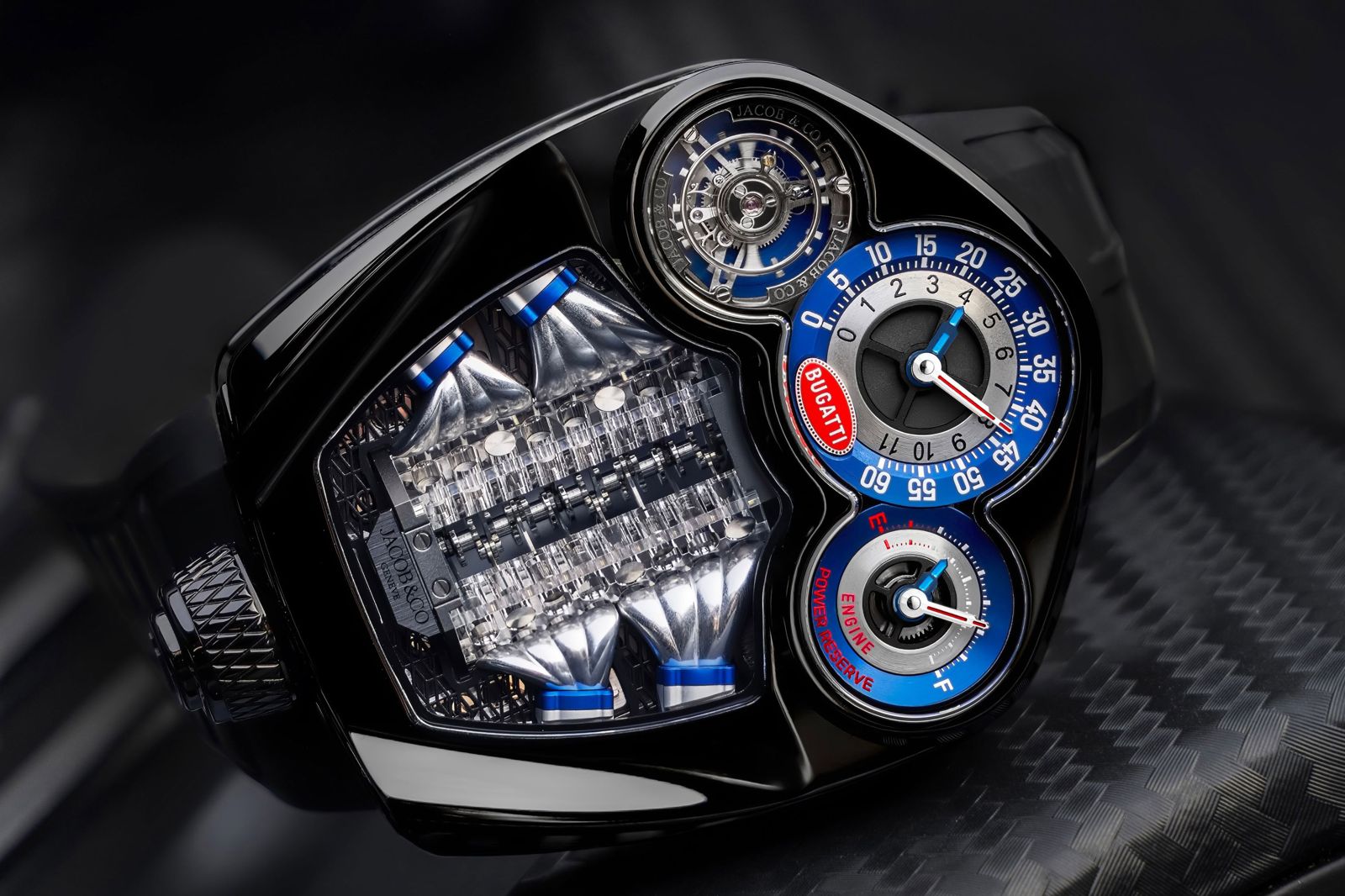 2019年JACOB & CO.與Bugatti宣布展開合作,之後迅速發表兩款超級複雜腕錶,分別是Twin Turbo Furious Bugatti Edition與Bugatti Chiron陀飛輪腕錶,後者更是以Bugatti Chiron超跑作為靈感,直接把超跑的元素與佈建結構轉化成手錶設計,重現W16引擎的16氣缸活塞壓縮機制與避震系統。
