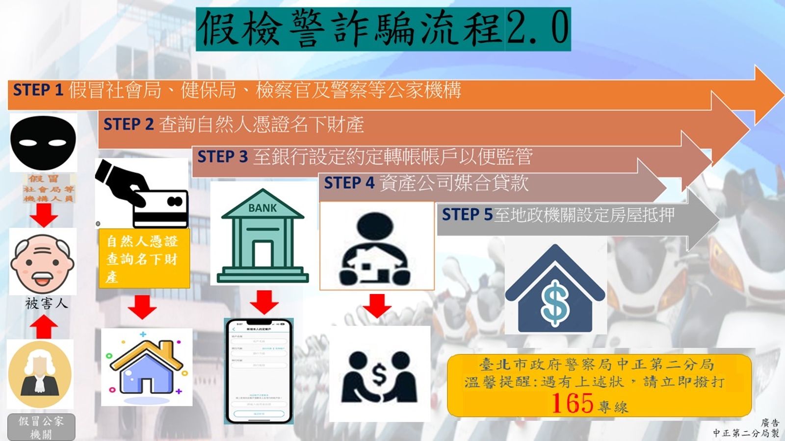 中正二分局表示,該案例中,因家中長者基於信賴政府機關威信亦因對司法程序不甚了解,一旦聽到涉及刑案即驚慌失措,成為「假檢警、真詐騙」大宗受害者。分局經過分析發現多數詐騙案有下列9大特徵: