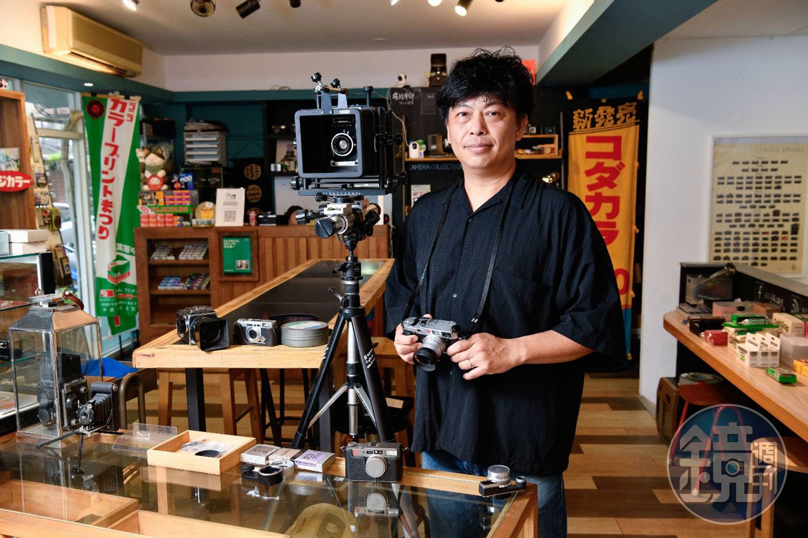 進門就看見舊日新聞記者採訪時常用的4×5底片相機,原是放置布料的骨董櫃在被淘汰前被葉仁傑買回成了展示櫃,街邊拆除的老舊路燈也成了店內裝飾,裝潢充滿復古、文青氛圍,處處皆可入鏡當背景。店名、字體很日本,相機從名古屋、大阪等地蒐集而來,「因為我老婆是日本人,谷口是她的姓氏。」