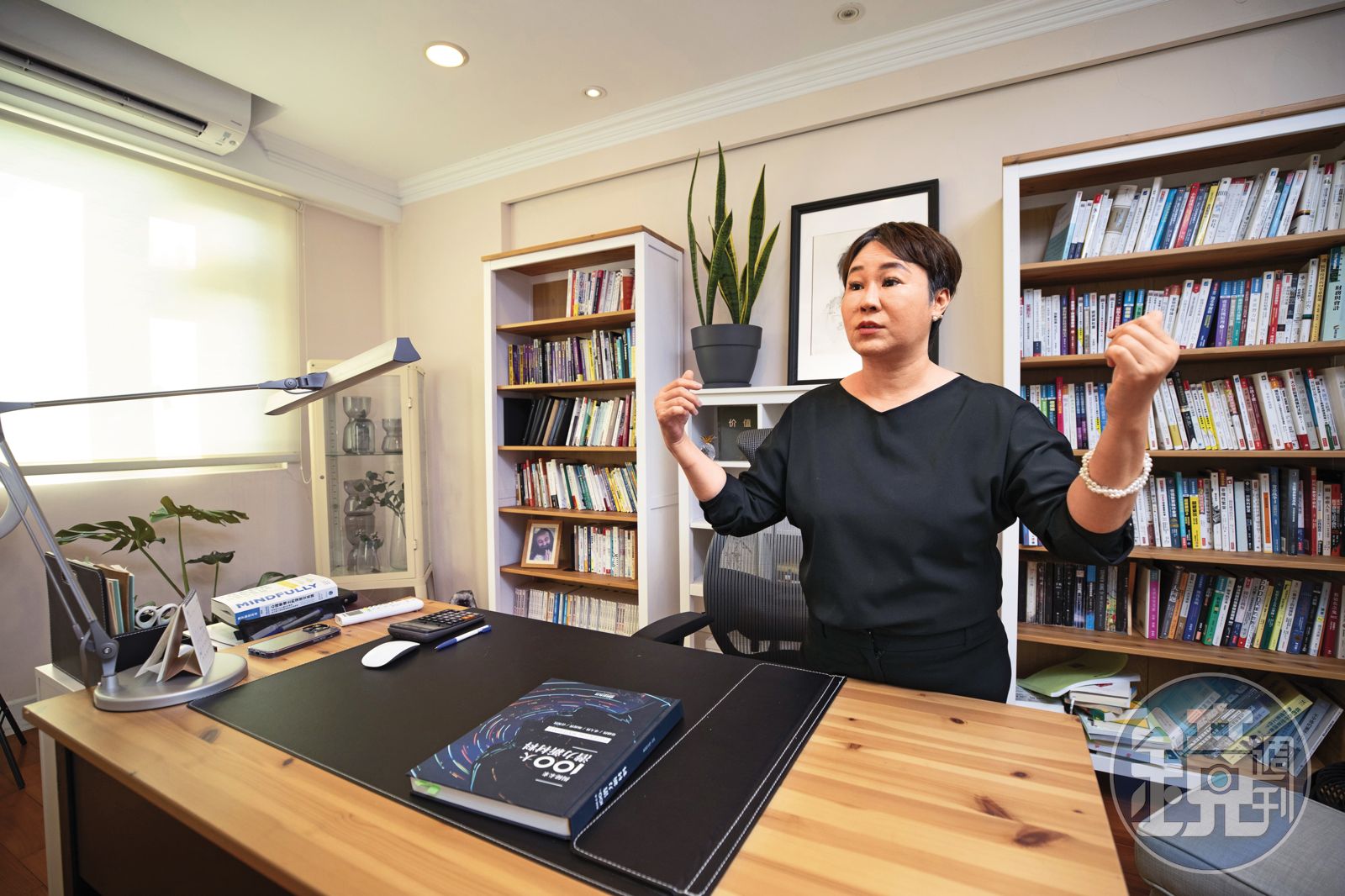 事實上,李雅雯的耐性也是磨練出來的,「市場在動盪的時候,要想辦法轉移注意力。」她會在書桌旁攤開瑜珈墊盤腿冥想,讓腦中的雜念慢慢消失,書櫃上琳瑯滿目的書籍,主題從投資、理財、寫作、心理到近年鑽研的科技產業都有,「我很喜歡閱讀,吸收各種知識對投資也有幫助。」