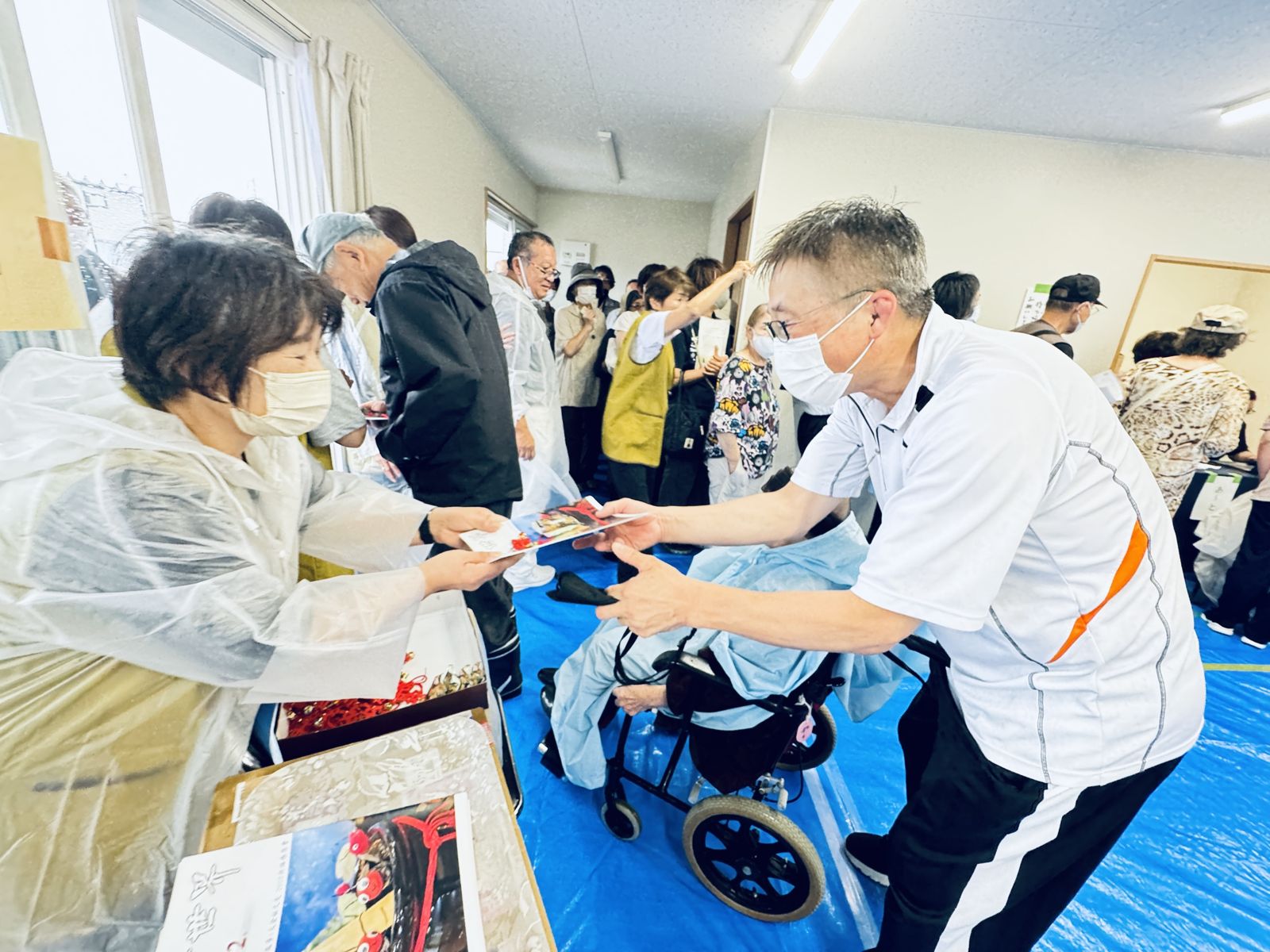 住在門前町的鄉親一森女士,看見志工們在大雨中為鄉親服務,感覺志工非常辛苦,很心疼志工們。於是送來一箱仙貝當作慰問禮物,以此感謝志工們為門前町鄉親的付出。輪島神轎燈柱會館見舞金發放場地,因為年初大地震的關係,地面有許多裂縫及高低落差,加上前來領取見舞金的鄉親大多數為年長者,志工在引導動線設計考量上更加謹慎。
