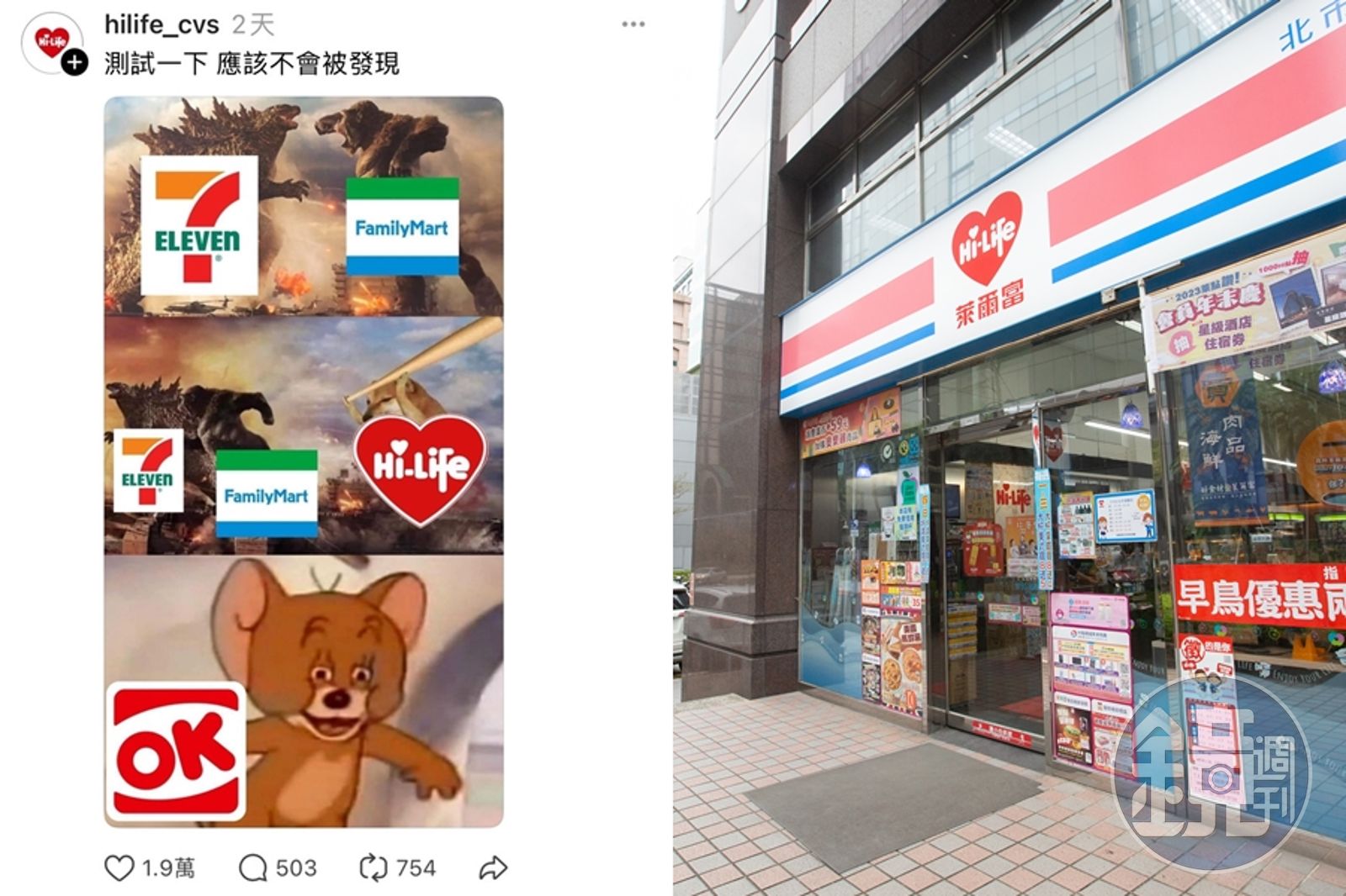 萊爾富超商3日前在其Threads帳號發布首篇貼文,可見他用哏圖將7-ELEVEN與全家比喻成哥吉拉大戰金剛,後自家萊爾富化身拿著棒球棍的柴犬追打哥吉拉與金剛,最後則是暗示OK超商代表傑利鼠,且搭配上傑利鼠的表情頗有諷刺意味。