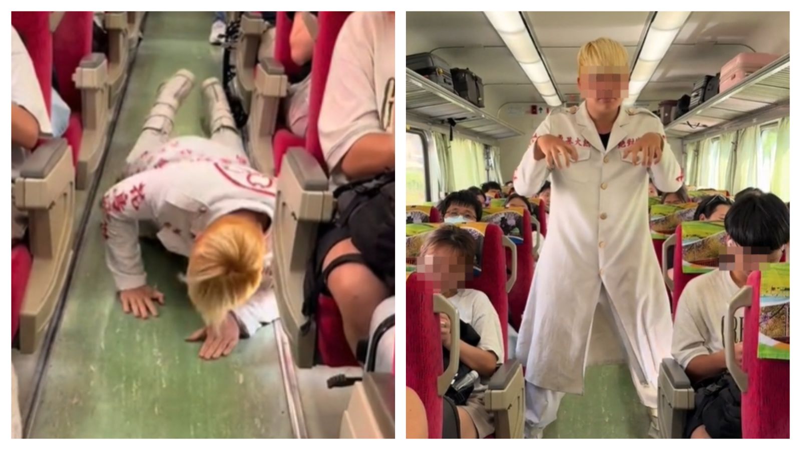 從王男貼出的影片,一則他趴在台鐵自強號車廂走道上的地板,一邊扭動身體向前爬行,一邊發出嘶吼聲,詭異行徑讓現場乘客大吃一驚紛紛側目。另一支影片同樣是在自強號上拍攝,只見王男手摀住屁股小跑步,同時高喊「我要拉屎」「我快憋不住了」,跑至車廂門口還假裝被鎖住,趴在門上狂呼「開門」,等到有人開門時,他卻突然趴在地上爬行,讓開門的女子傻眼趕緊繞道離開。