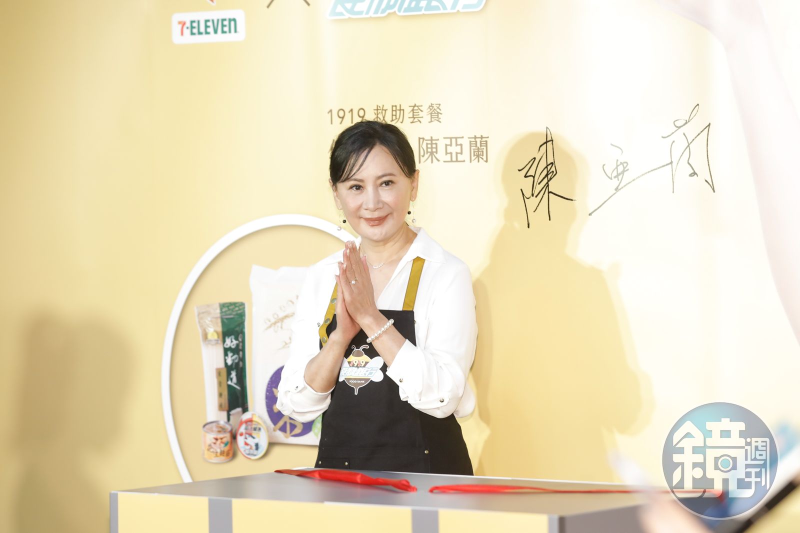金鐘視帝陳亞蘭今(9日)出席活動,為了1919食物銀行擔任代言人,談及是否有曾沒錢吃飯的經驗,陳亞蘭透露,雖不至於此,但自己是工作狂,曾經忙到一整天都沒吃飯、沒喝水,現在則是試著學習放鬆心情,調養身體。