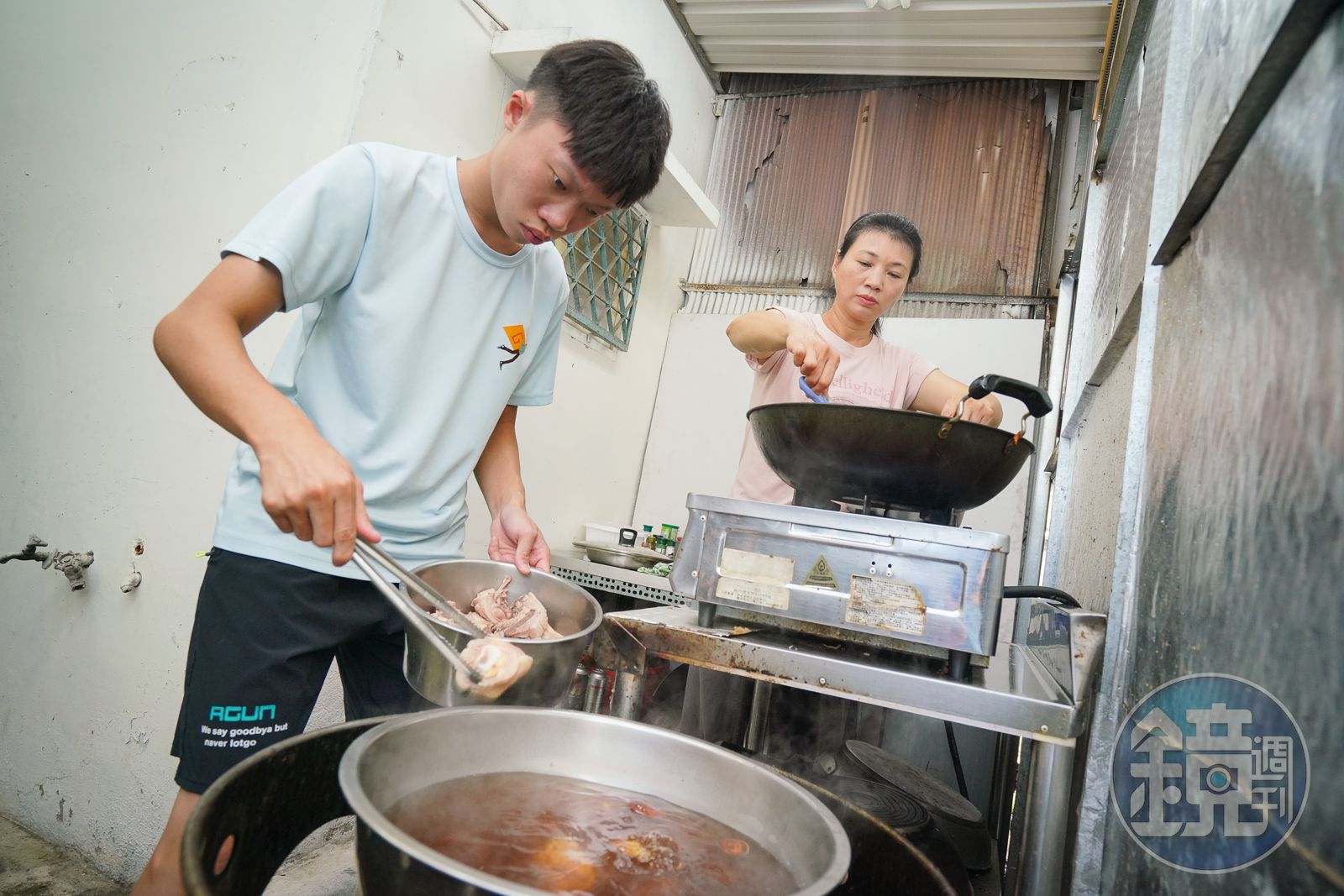 張豔君招呼完客人,又趕回廚房炒醬,火爐前熱氣悶得人無法久待,張豔君依然滿臉笑容,舉止優雅,「炒干貝醬要看著,因為每下一個食材的火候和時間都不一樣。」