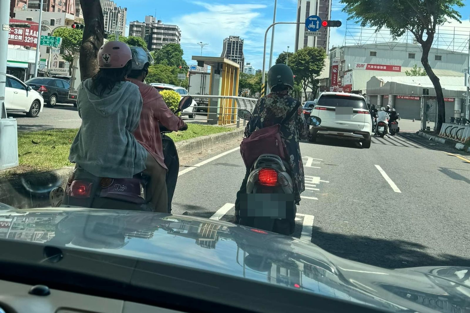 該名駕駛在臉書社團「爆料公社二社」分享行車畫面,只見前方兩部機車在路口紅燈時,選擇停在車道內側的樹蔭下遮陽,與前方路口車輛空出一段距離。只是兩位騎士突然停下,令駕駛相當不滿「到底為什麼要突然煞車躲太陽…有夠危險!」
