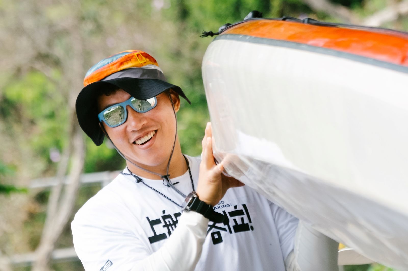 而在拍攝時也會有輕鬆的一面,郭泓志幹話非常多,跟KID(林柏昇)成為節目組「五四三幹話最佳拍檔」,跟製作人和導演互動中也是這樣,常用不正經的玩笑話,真真假假的表達他的意圖。但是,當他老婆兒子在的時候,他完全變了個人,非常正經。製作人更透露郭泓志若想要達成某個目標,「纏人工夫」就會發揮到極限,像纏住輕艇教練、學員們,纏著他們教他所有技巧、陪他練習。郭泓志還想要夏浦洋當划向石垣島的第8人,見到製作人或其他工作人員,就會疲勞轟炸,不斷推薦夏浦洋有多好、多適合。