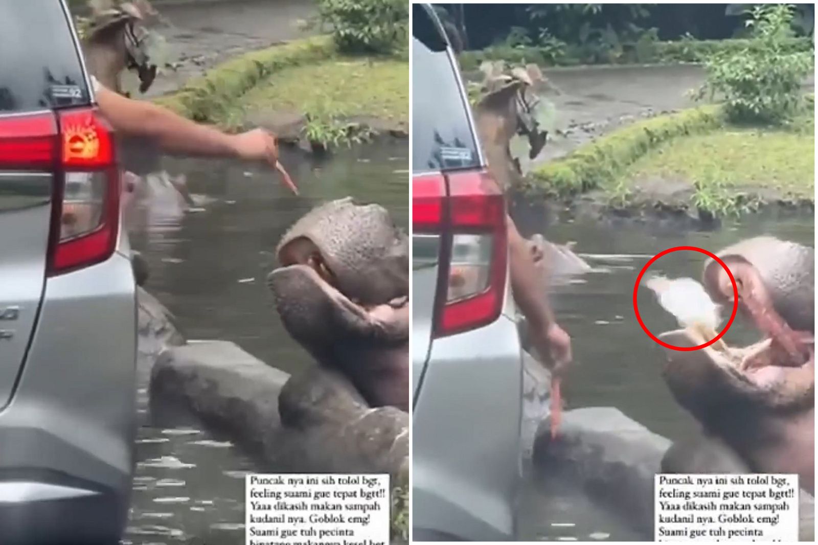 影片可見,這名男子故意用一根紅蘿蔔,引誘河馬注意,隨後再把塑膠袋,對準河馬的大口丟進去,讓河馬誤食塑膠袋,只要一不小心,河馬隨時可能因此喪命。影片傳開後,引發許多網友的憤怒,紛紛大罵這名男子:「這根本要被抓起來才對!」、「請園區將他列入黑名單。」、「太可惡了!」、「根本有病。」