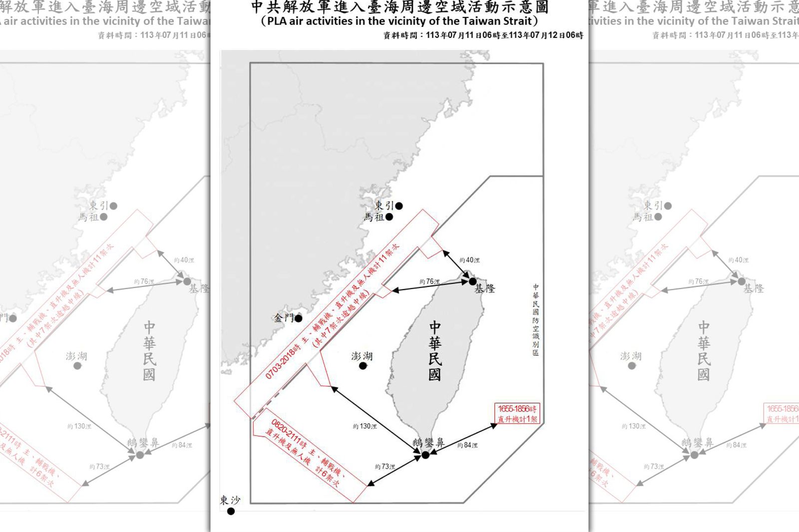 國防部今(12日)於「即時軍事動態」指出,自昨(11日)6時至今日6時止,偵獲共機18架次、共艦8艘次持續在台海周邊活動,其中逾越海峽中線進入北部、西南與東部空域的共機有14架次;對此,國軍運用任務機、艦與岸置飛彈系統嚴密監控與應處。 據空域活動示意圖,主、輔戰機、直升機及無人機共11架次於西部海域活動,其中逾越海峽中線7架次,最近離基隆約40浬、離鵝鑾鼻約130浬;主、輔戰機、直升機及無人機共6架次於西南海域活動,最近離鵝鑾鼻約73浬;直升機1架次則在東部海域,最近鵝鑾鼻約84浬。
