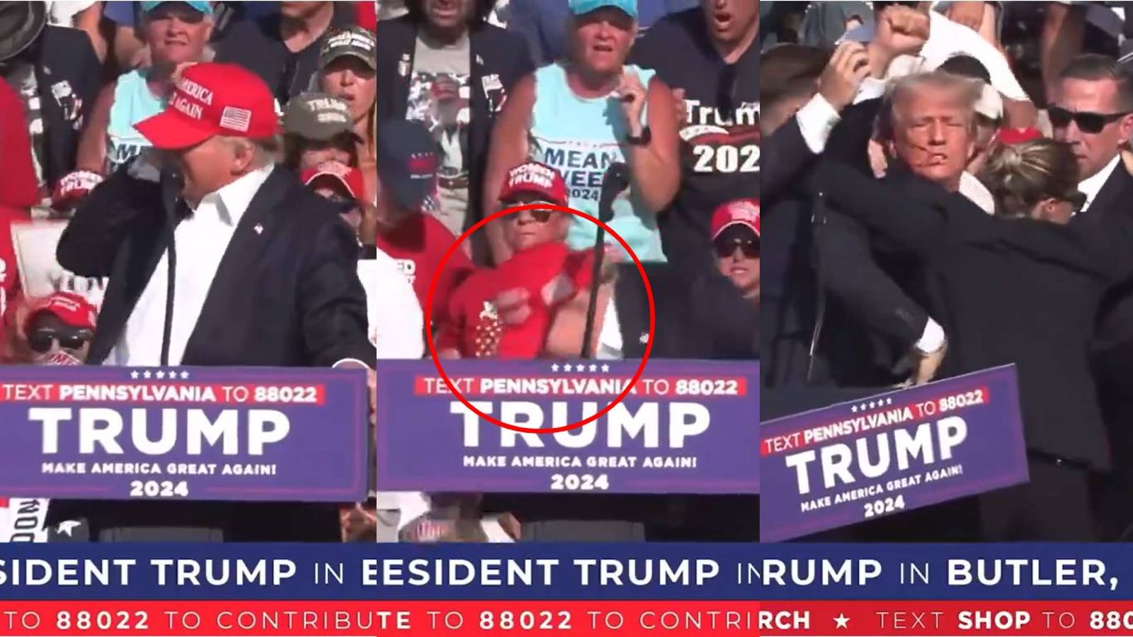 川普發表演說時,現場先連傳多聲槍響,川普摀住自己右耳,接著有人大喊快坐下後,川普立刻蹲下躲在演講台,隨扈們全部衝上台保護川普,現場尖叫聲不斷。