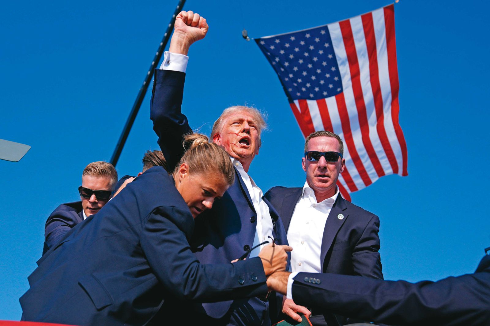 那一幕迅速傳到全世界的每個角落。這不是好萊塢電影的情節,而是流著鮮血的真人版美國英雄。不管再怎麼討厭他,都必須佩服他。這個人的構造裡頭,有一些異於常人的元素,尤其是對比現任總統拜登的老態龍鍾。