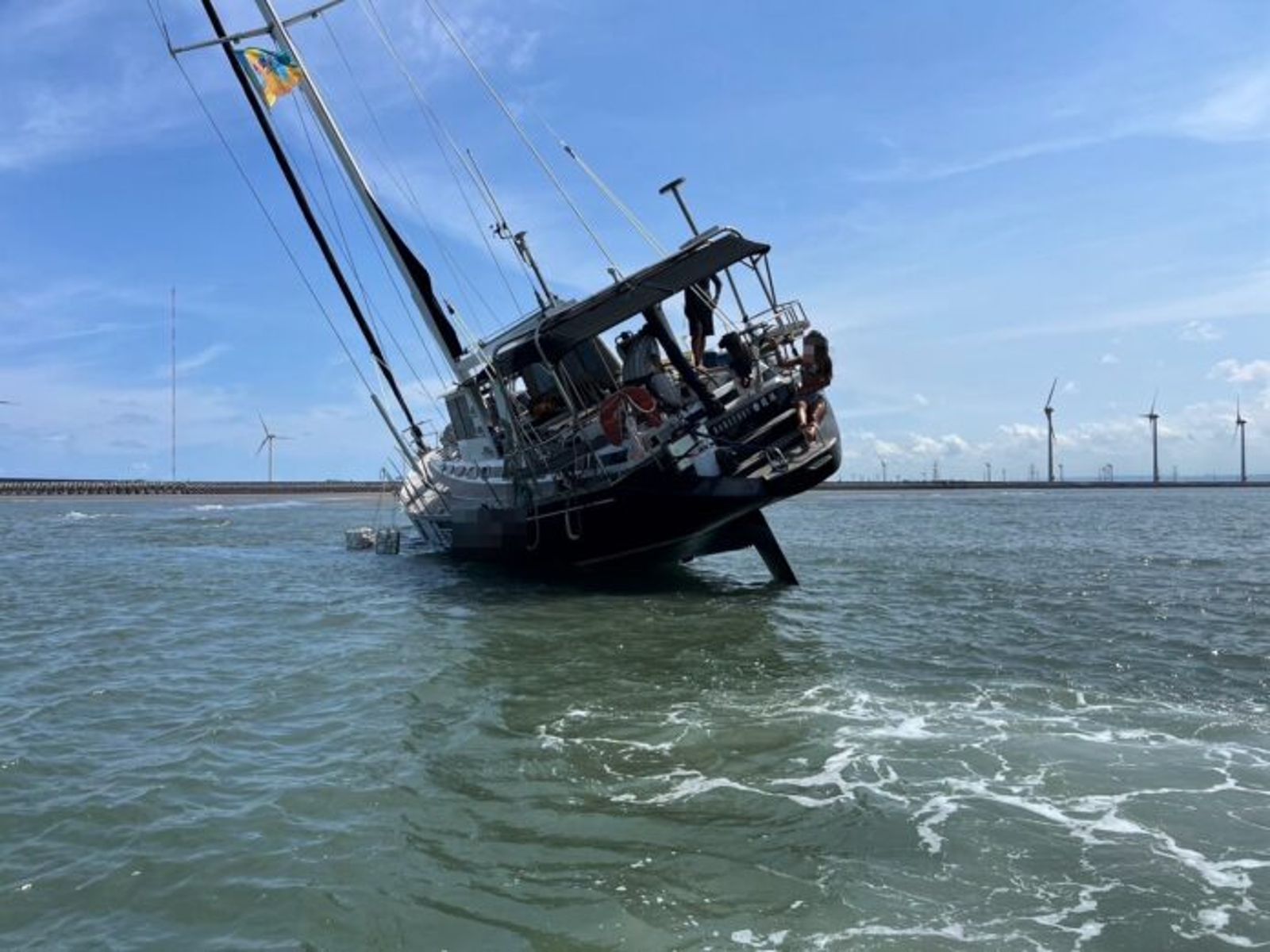 「光腳號」帆船擱淺傾斜9小時,所幸人員均安。(翻攝記者爆料網)發布時間:2024.07.16 11:57 臺北時間
