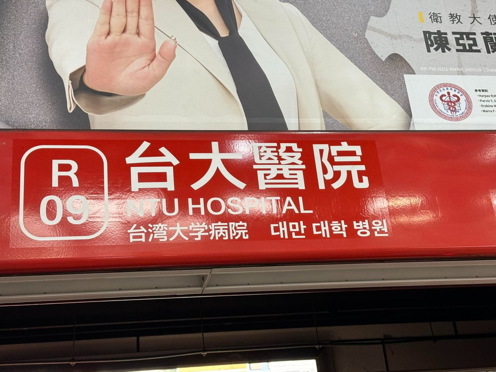 陳志金近日在臉書PO文,附上一張北捷紅線月台標示台大醫院站的照片,大大的繁體中文下方,除了有英語「NTU Hospital」,還有日文及韓文翻譯。