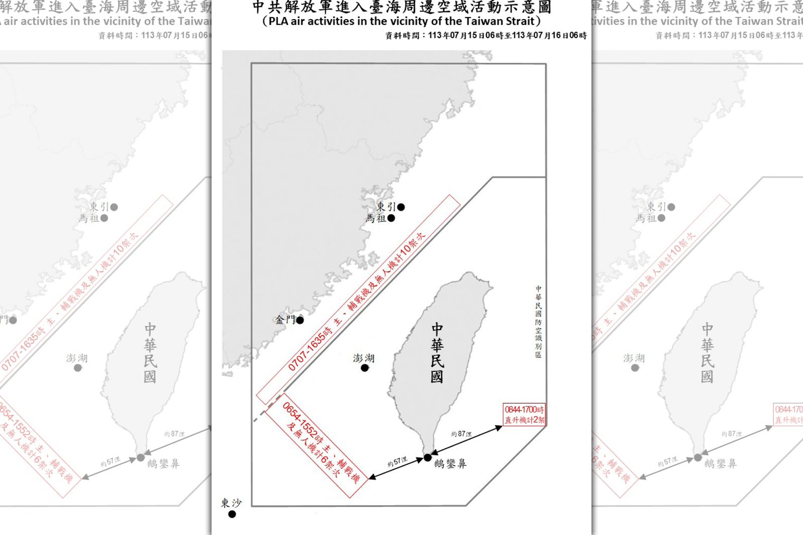 據國防部公布的中共解放軍進入台海周邊空域活動示意圖顯示,主、輔戰機及無人機共10架次在西部海域活動;主、輔戰機及無人機有6架次在西南海域活動,最近離鵝鑾鼻約57浬;直升機2架次在東部海域活動,最近離鵝鑾鼻約87浬。