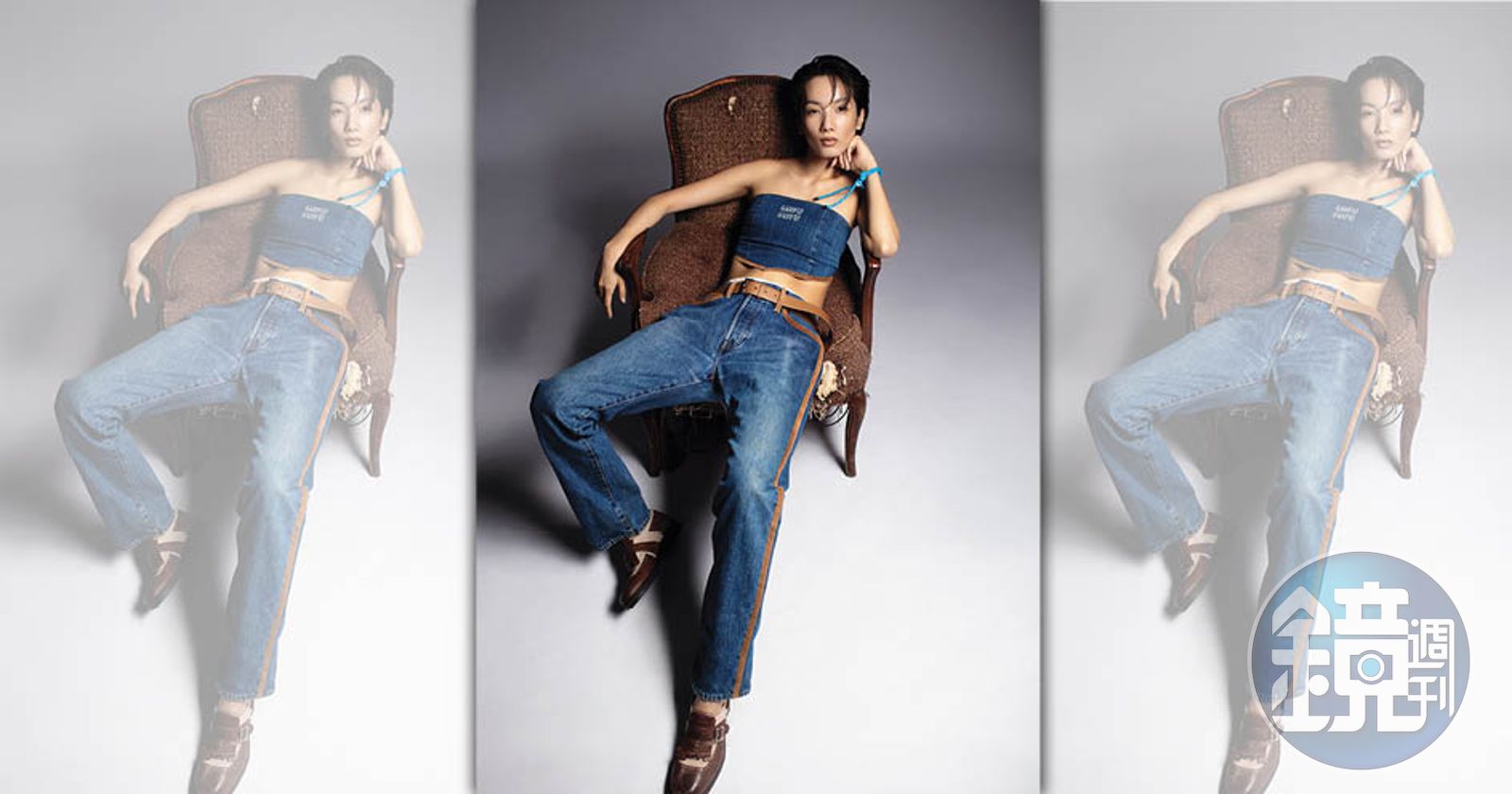 丹寧繫帶上衣 價格店洽 by Miu Miu/丹寧長褲 NT$125,000 by Miu Miu/棉質內搭褲 NT$21,500 by Miu Miu/拼接樂福鞋 NT$51,000 by Church's X Miu Miu/藍色手鍊 NT$9,800 by Miu Miu/棕色腰帶 價格店洽 by Prada