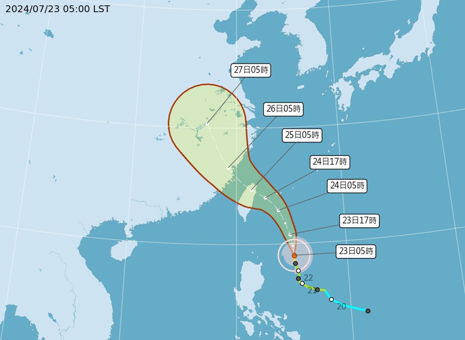 氣象預報員謝佩芸表示,凱米今下半天至明週三朝西北轉向,將於24、25日2天通過台灣北端,預計最快今天中午前後就會發陸警。而今上半天颱風影響不明顯,但隨著颱風外圍環流接近台灣,迎風面北部、宜花上半天將有間歇性風雨,下半天至晚間風雨越來越明顯;至於中南部則維持上午多雲到晴、午後有雷陣雨。