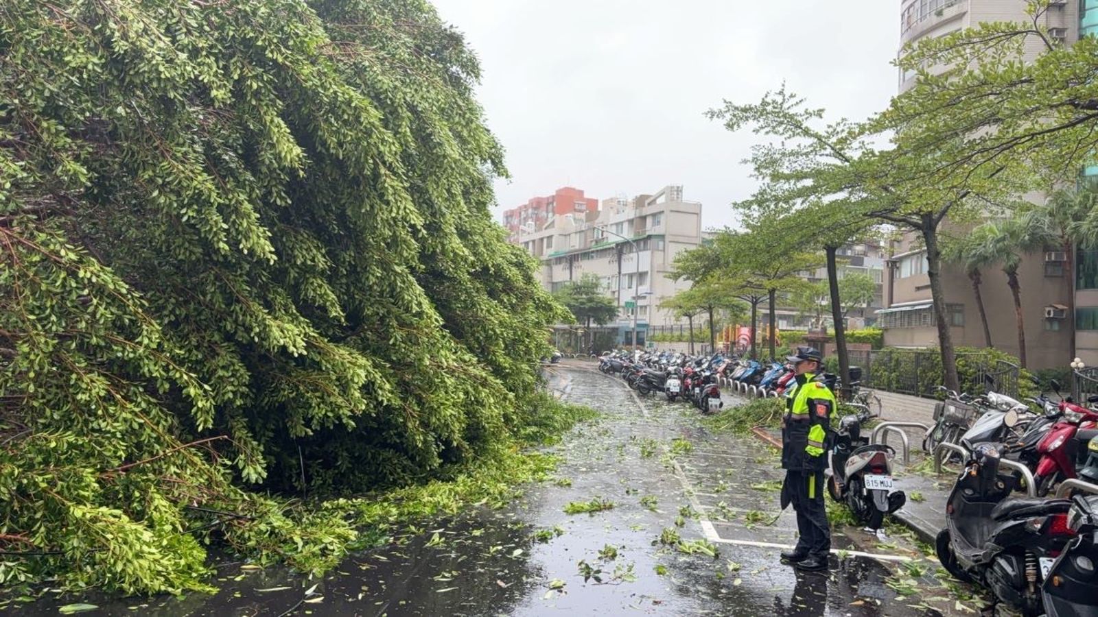 文德派出所於24日16時許獲報,轄內文德路66巷14弄路樹倒塌,經派員立即馳赴現場處置,發現公園內大型榕樹橫倒,阻斷該巷弄雙向車道影響車輛通行,且有兩條電線亦橫斷在道路上,立即通報公園路燈工程管理處及台電公司派員排除,搶修人員抵達前,為利車輛通行,員警先行徒手斬除倒塌路樹前端枝葉,先行開通東往西方向車道。